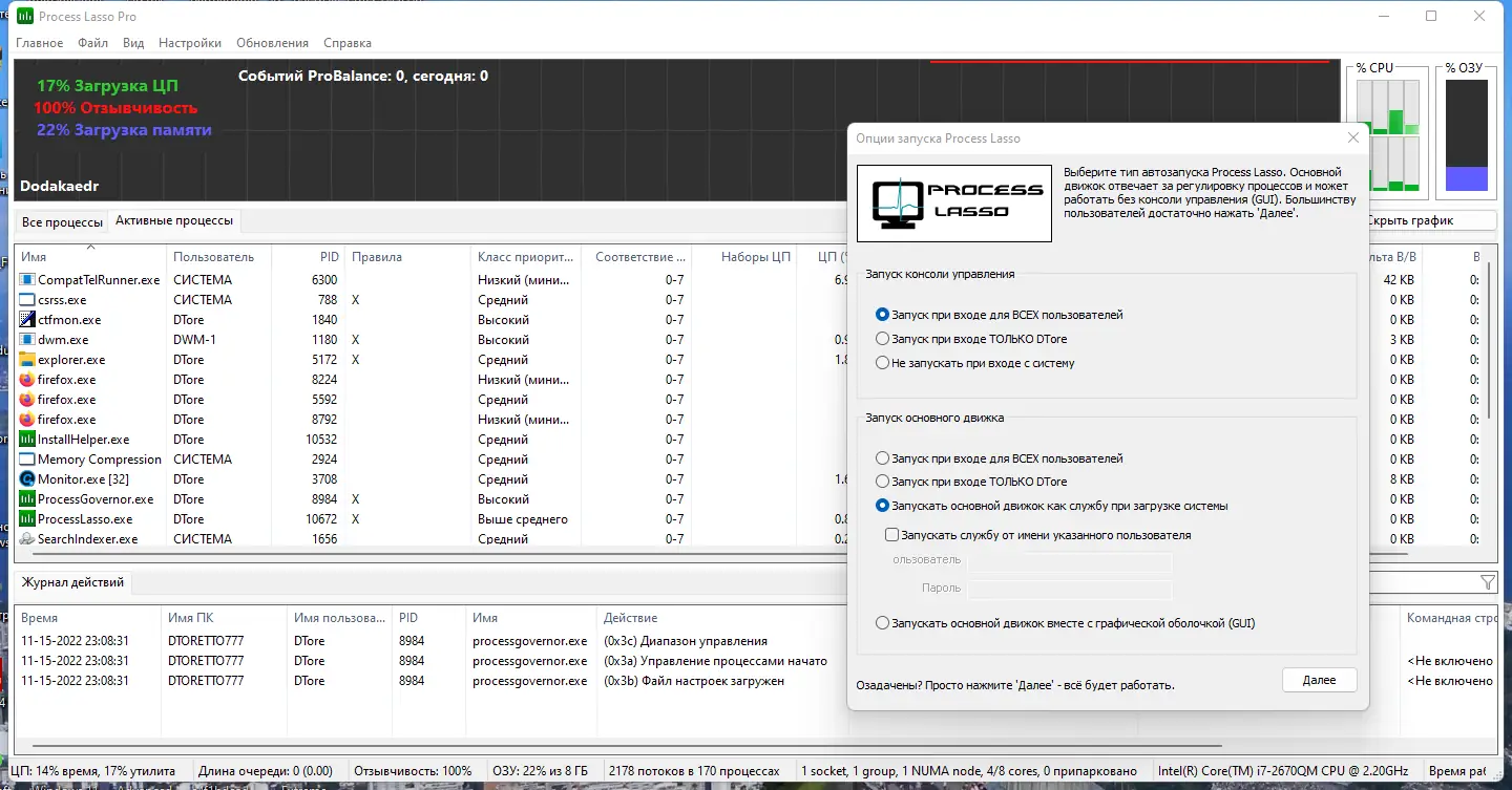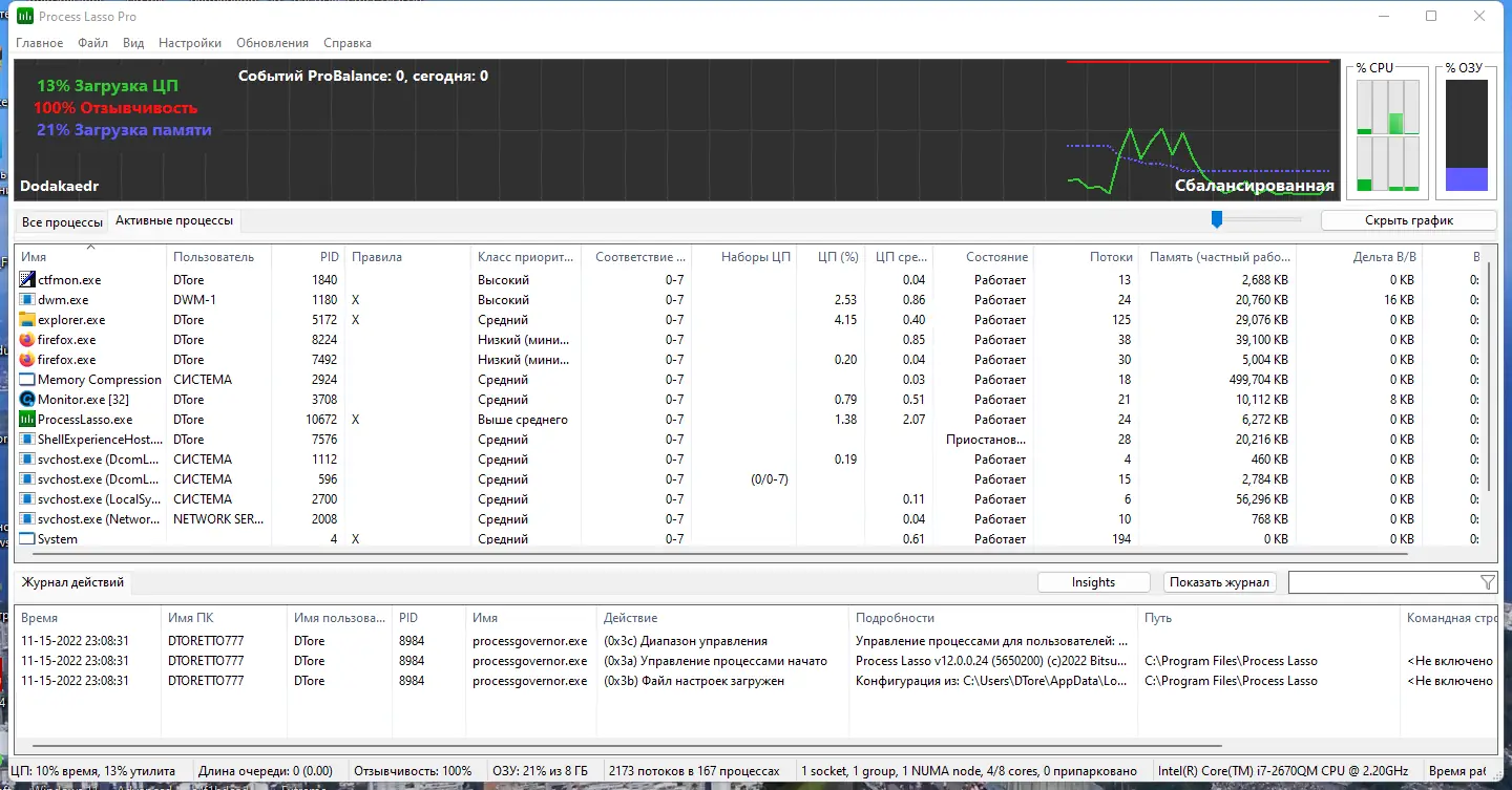Process Lasso позволяет вручную или автоматически манипулировать запущенными на компьютере процессами, что помогает добиться быстродействия и стабильности системы. Программа отслеживает активность программ, которые сильно нагружают центральный процессор, и ограничивает их влияние. Это помогает избежать зависания системы и повышает отклик системы благодаря технологии ProBalance, которая аккуратно перераспределяет приоритеты процессов. Windows по умолчанию допускает запуск программ, полностью загружающих процессор, что вызывает неудобства и сниженную стабильность работы. Использование Process Lasso существенно повышает управляемость процессами и делает работу более комфортной и эффективной.