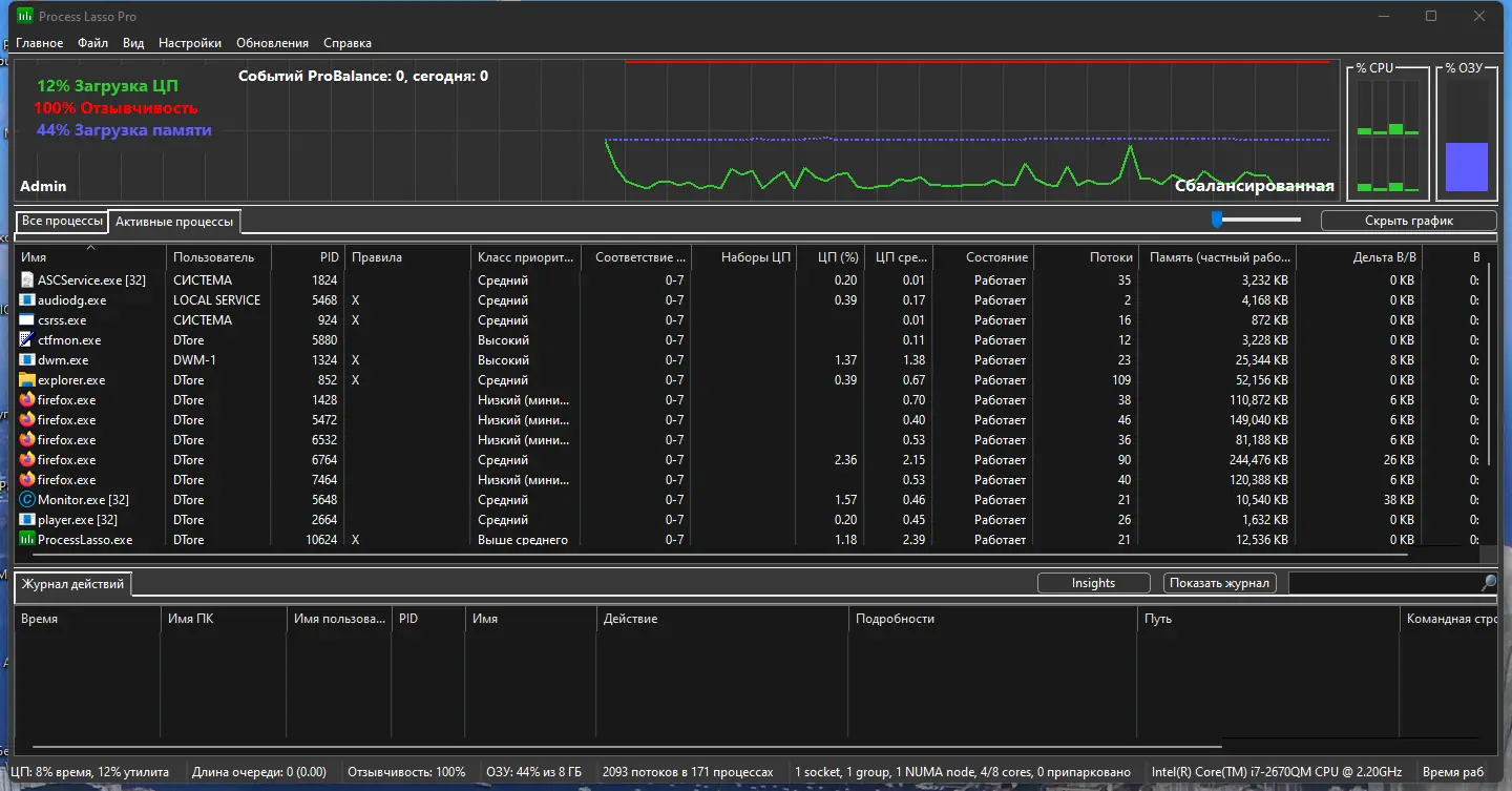 Process Lasso позволяет вручную или автоматически манипулировать запущенными на компьютере процессами, что способствует повышению быстродействия и надежности системы. Она постоянно отслеживает программные процессы, ограничивая загрузку центрального процессора активными приложениями, и применяет автоматические настройки приоритетов для улучшения отклика системы. Технология ProBalance аккуратно перераспределяет приоритеты процессов, предотвращая зависание системы и обеспечивая стабильную работу даже при высокой нагрузке. Совместимость с Windows 7, 8/8.1, 10 и 11, а также поддержка x32 и x64 Bit позволяют использовать данное решение на различных конфигурациях.