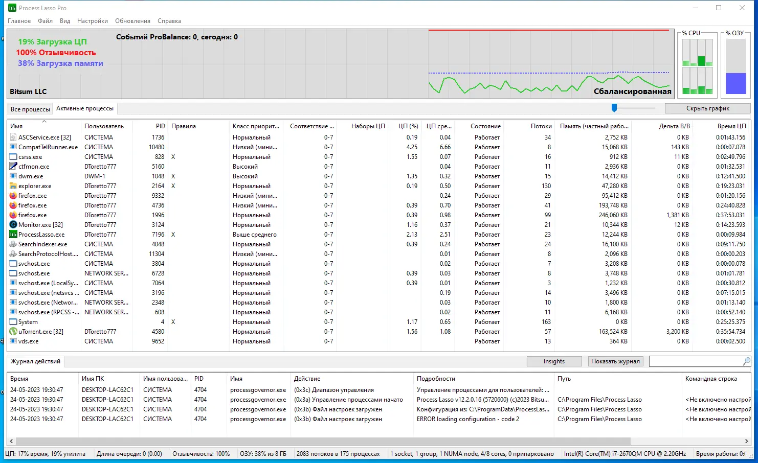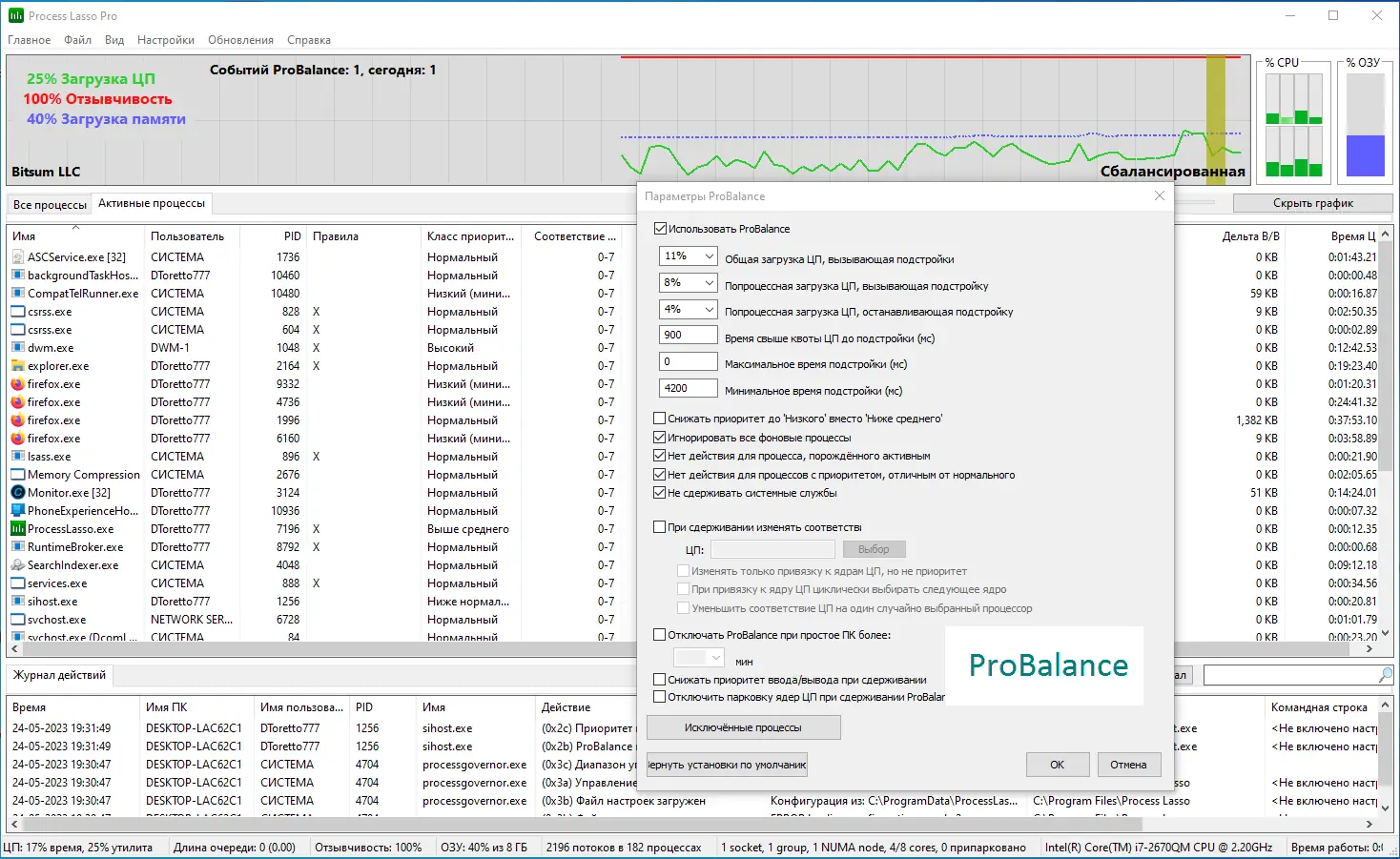 Process Lasso — это продвинутый инструмент, который значительно повышает стабильность и отзывчивость системы за счёт интеллектуального управления процессами. Он отлично справляется с автоматической балансировкой ресурсов и предлагает множество вариантов настройки под индивидуальные нужды пользователя.