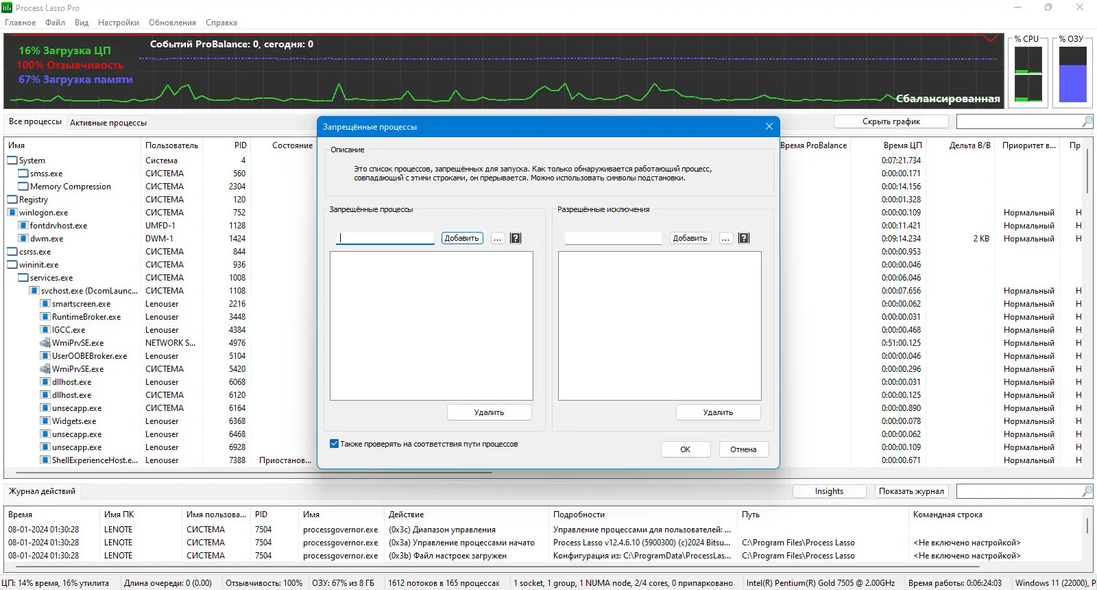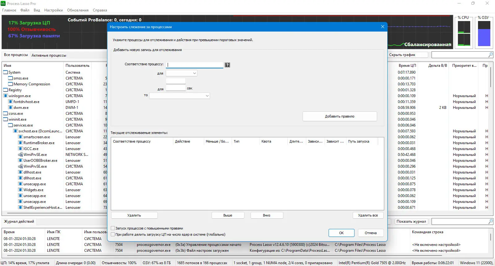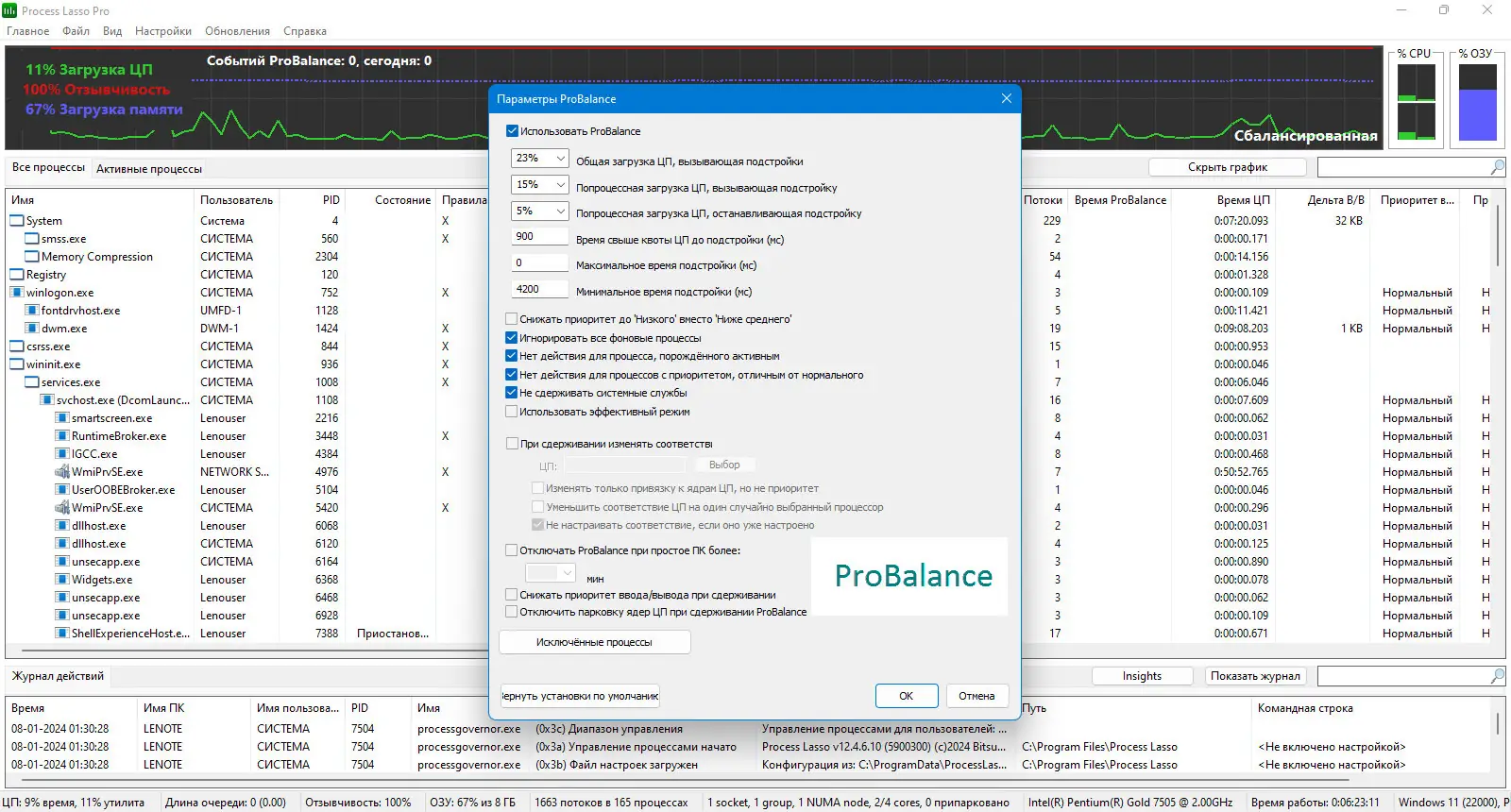 Process Lasso позволяет вручную или автоматически манипулировать запущенными на компьютере процессами, что способствует достижению максимальной скорости и стабильности работы системы. Программа отслеживает процессы, активно использующие центральный процессор, и ограничивает их ресурсоемкость, тем самым повышая отклик системы. Она применяет технологию ProBalance (Process Balance), которая аккуратно перераспределяет приоритеты задач, предотвращая загрузку системы полностью одним процессом. Это особенно важно в средах с интенсивными задачами, где Windows по умолчанию позволяет программам полностью захватывать процессор, вызывая зависания и неудобства.