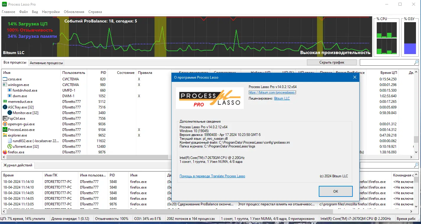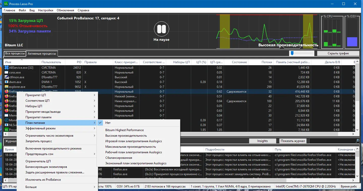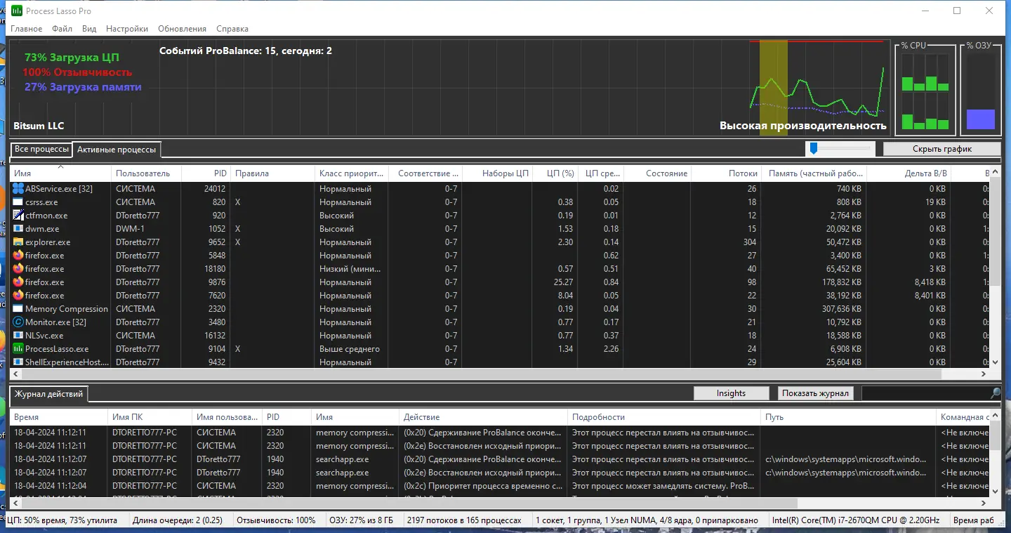 Process Lasso — эффективное решение для ручного и автоматического управления процессами в операционной системе Windows. Этот инструмент позволяет повысить быстродействие и стабильность системы, контролируя нагрузку на центральный процессор. Благодаря технологии ProBalance, программа аккуратно перераспределяет приоритеты запущенных приложений, предотвращая зависания и снижая нагрузку полностью загруженного ЦП. Она наблюдает за активностью программ и ограничивает ресурсоемкие процессы, что значительно повышает отклик системы и комфорт работы.