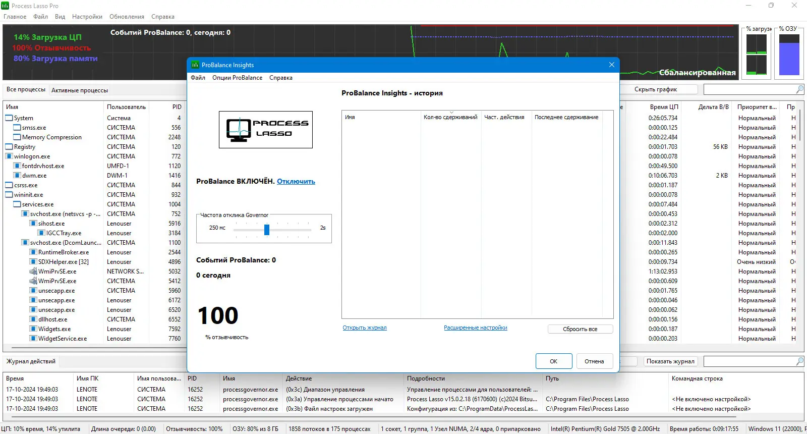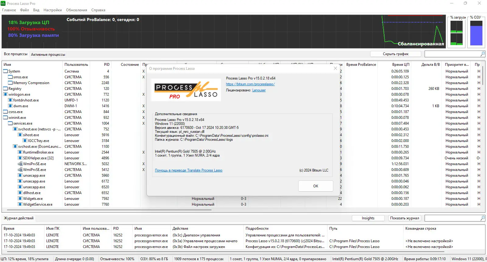 Process Lasso — это мощное решение для управления процессами, позволяющее максимально повысить быстродействие и стабильность вашей системы. Благодаря автоматическому и ручному регулированию процессов, программа помогает оптимизировать работу компьютера и избегать зависаний, повышая отклик системы и стабильность работы.