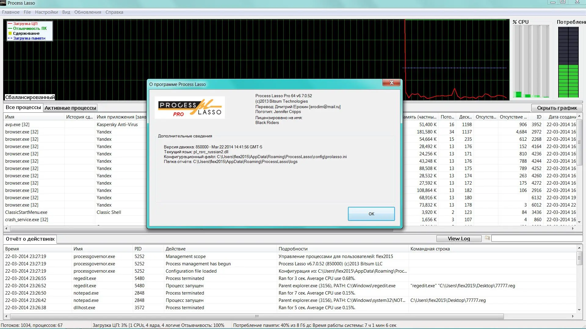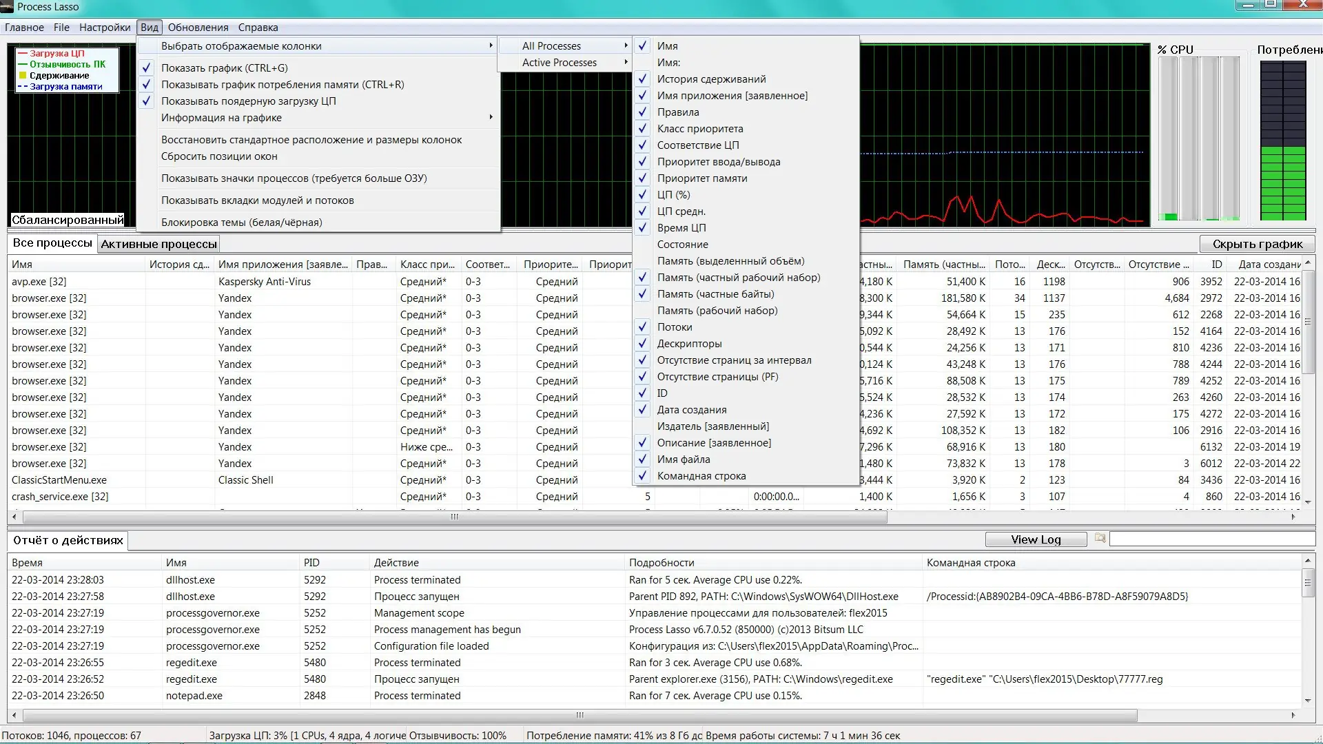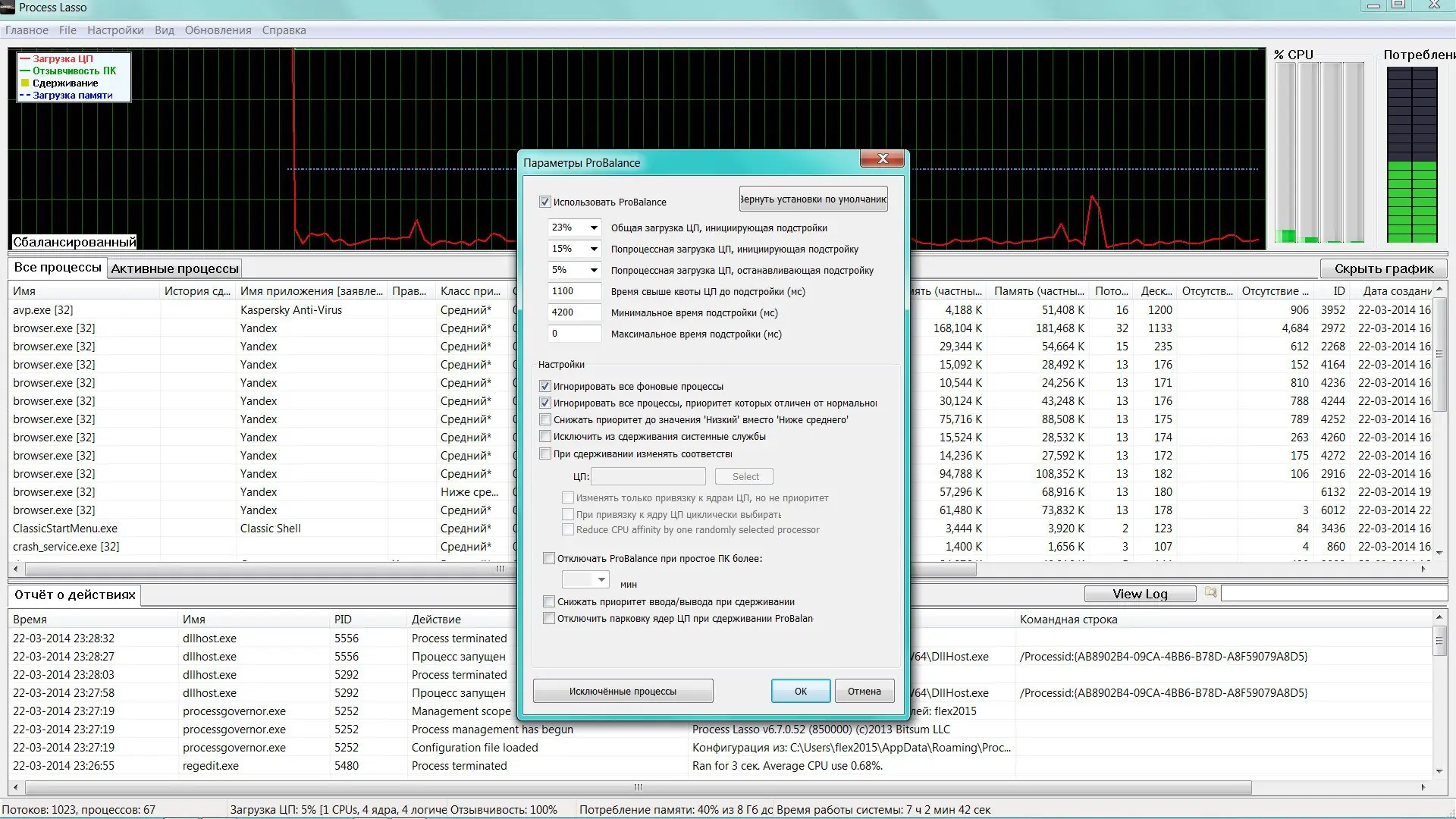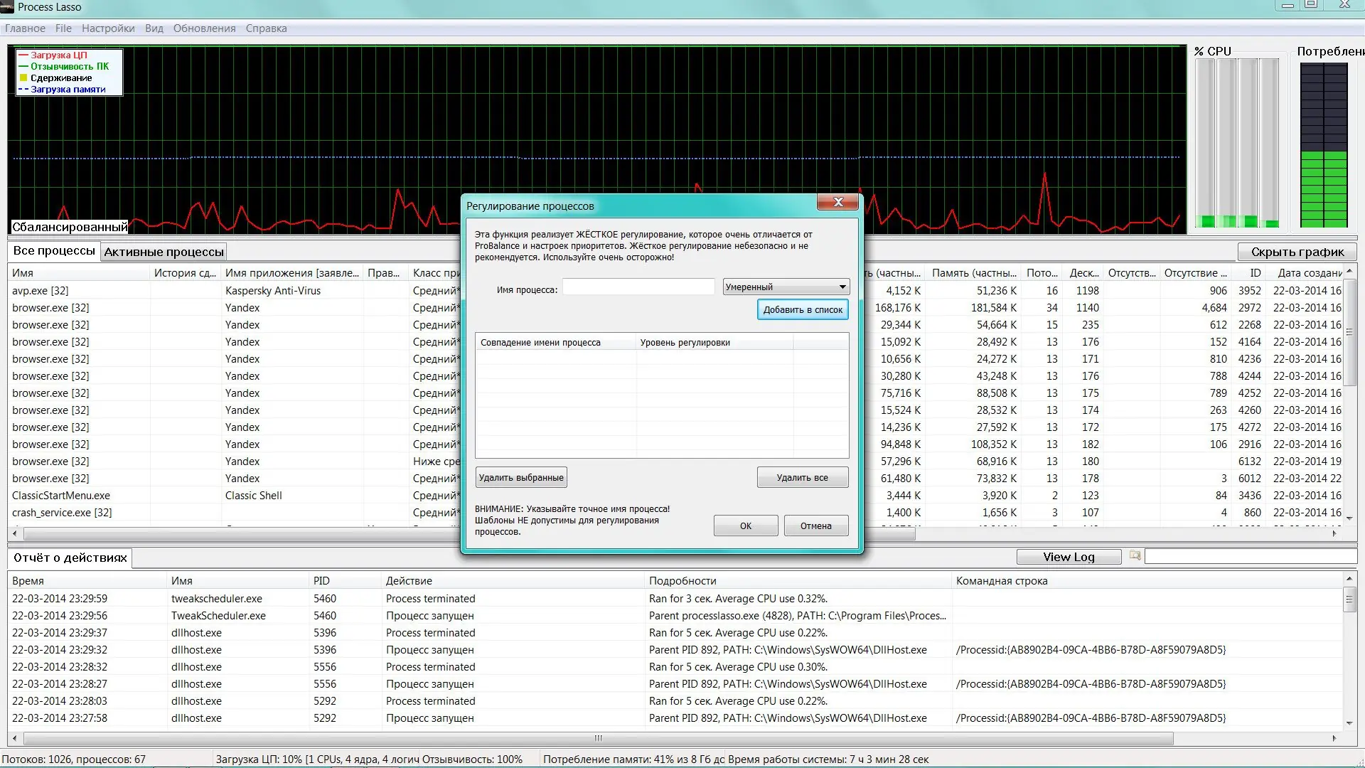 Process Lasso Pro — универсальный инструмент для управления процессами, который позволяет вручную или автоматически регулировать запущенные приложения с целью повышения быстродействия и стабильности системы. Благодаря постоянному наблюдению за программами, активно загружающими процессорное время, программа автоматически ограничивает их выполнение, что значительно улучшает отзывчивость системы. Кроме того, она может снижать приоритет определённых процессов по умолчанию, предотвращая зависание или замедление работы ПК.