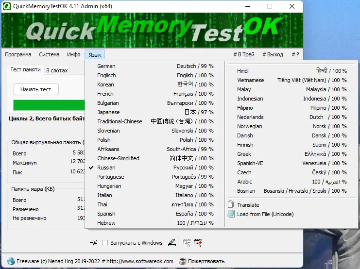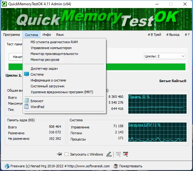 - Запустите файл QuickMemoryTestOK.exe для начала тестирования.