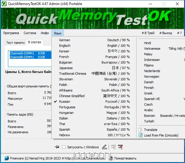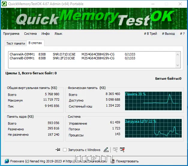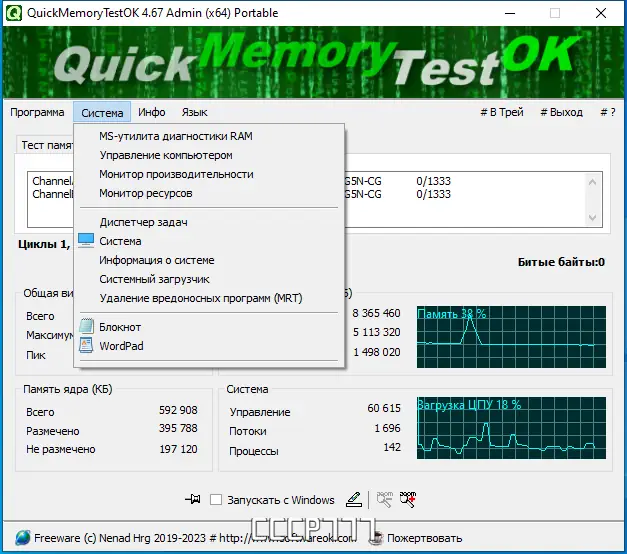QuickMemoryTestOK — это компактная и эффективная утилита для быстрой диагностики оперативной памяти на наличие ошибок, которая помогает выявить возможные причины системных сбоев и изучить поведение ПК при высокой нагрузке на ресурсы.