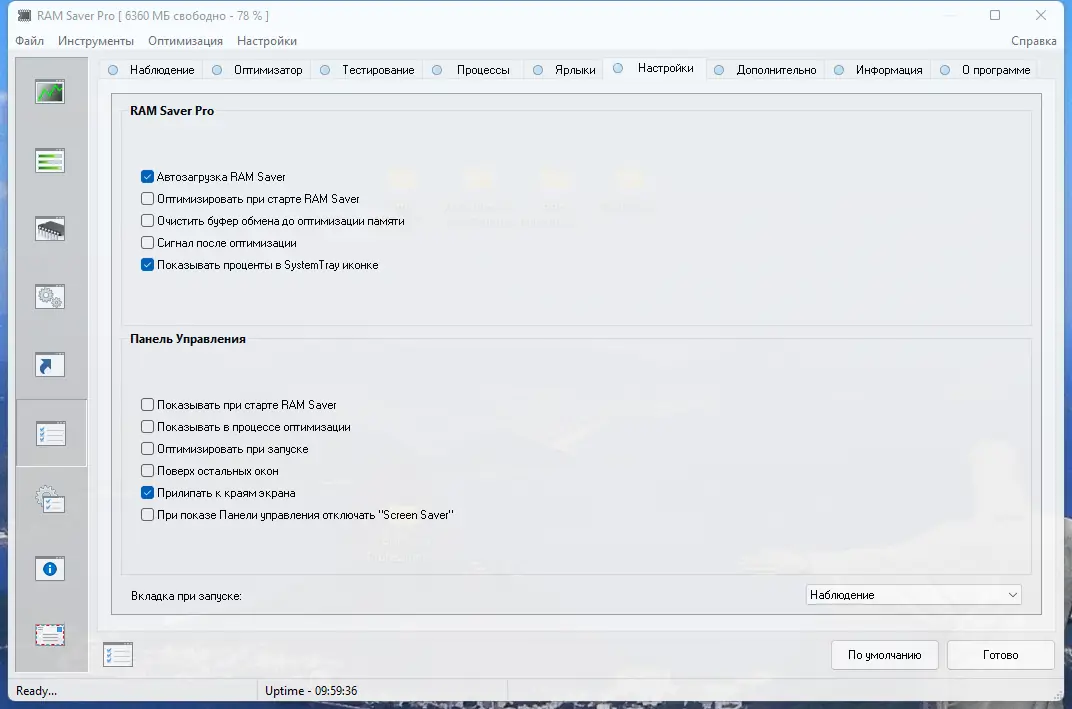 Эта программа служит для дефрагментации памяти, восстановления утечек, временной очистки ненужных драйверов и процессов, а также автоматической и интеллектуальной оптимизации системы. Благодаря RAM Saver пользователь получает возможность поднять рабочие показатели даже на слабых компьютерах за счет освобождения оперативной памяти и ускорения работы процессора. Утилита специально разработана для профессиональных пользователей, которым необходим быстрый доступ к системным ресурсам и полный контроль за состоянием памяти и процессов.