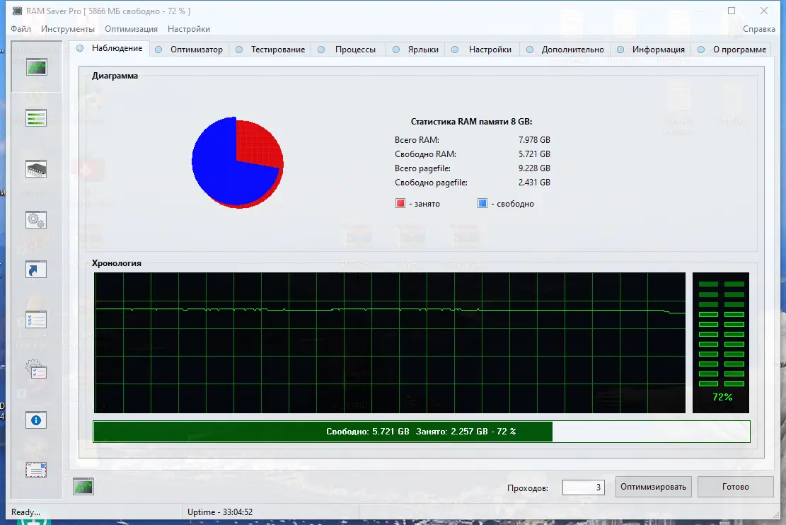 RAM Saver Professional предлагает широкий спектр профессиональных инструментов для мониторинга и оптимизации памяти. Благодаря автоматическим функциям и возможностям глубокого контроля, программа помогает поддерживать систему в максимально стабильном состоянии.