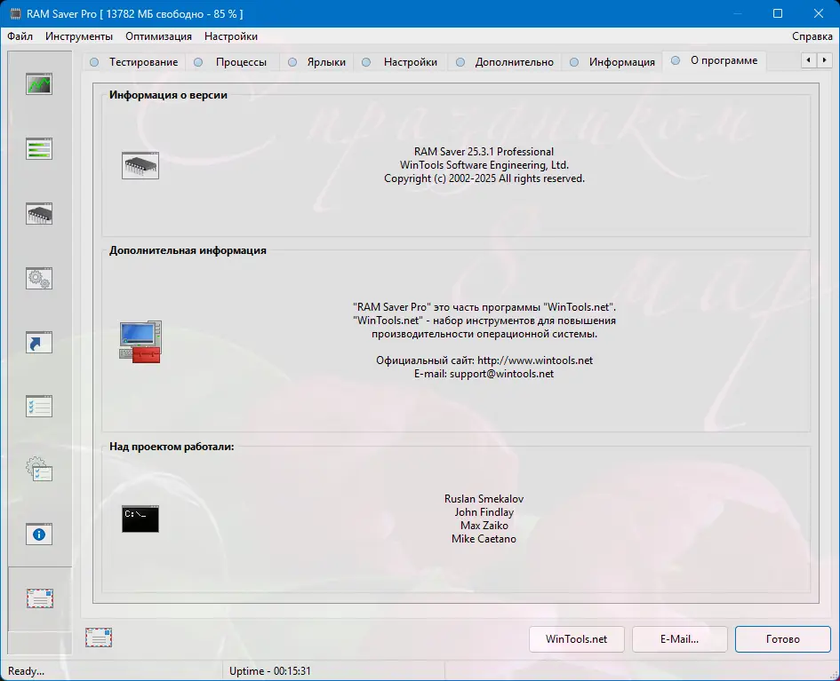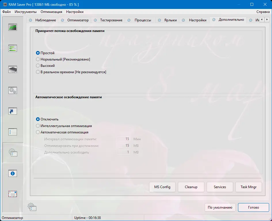 RAM Saver — это профессиональный инструмент для мониторинга, очистки и оптимизации оперативной памяти, предназначенный для повышения производительности операционной системы и приложений. Он помогает освободить ресурсы, устраняя утечки памяти и дефрагментируя системную память для более эффективной работы системы даже на слабых компьютерах.