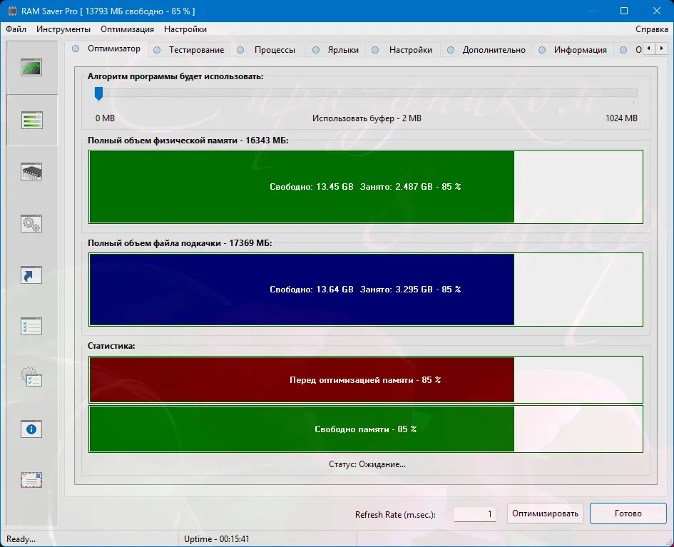 Программа RAM Saver Pro служит для быстрого и эффективного мониторинга использования оперативной памяти, автоматической очистки процессорных и RAM-ресурсов, а также для повышения общей производительности системы. В процессе работы она дефрагментирует системную память, восстанавливает утекшие ресурсы и помещает неиспользуемые драйверы и библиотеки в swap-файл, что обеспечивает более быструю работу приложений и системы в целом. Инструмент также позволяет управлять процессами в RAM, создавать ярлыки для ускорения задач, а также осуществлять автоматическую оптимизацию с выводом статистики.