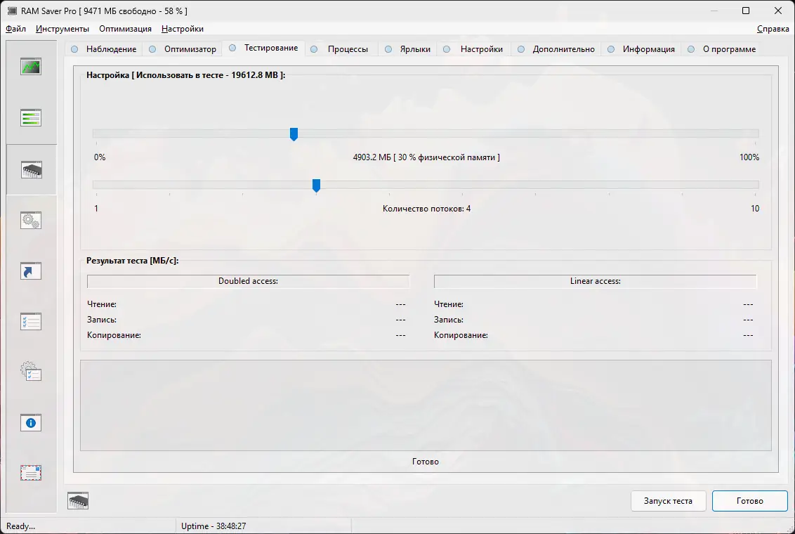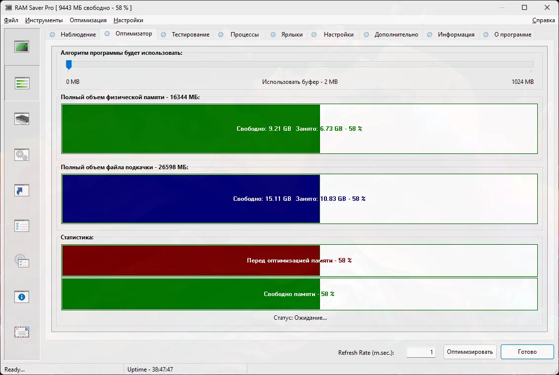 - Гибкая оптимизация с выводом статистики и тест производительности RAM