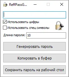 ReffPassGen — это простая в использовании программа для генерации надежных паролей с возможностью быстрого сохранения или копирования в буфер обмена. Идеально подходит для пользователей, нуждающихся в безопасных паролях без лишних хлопот.