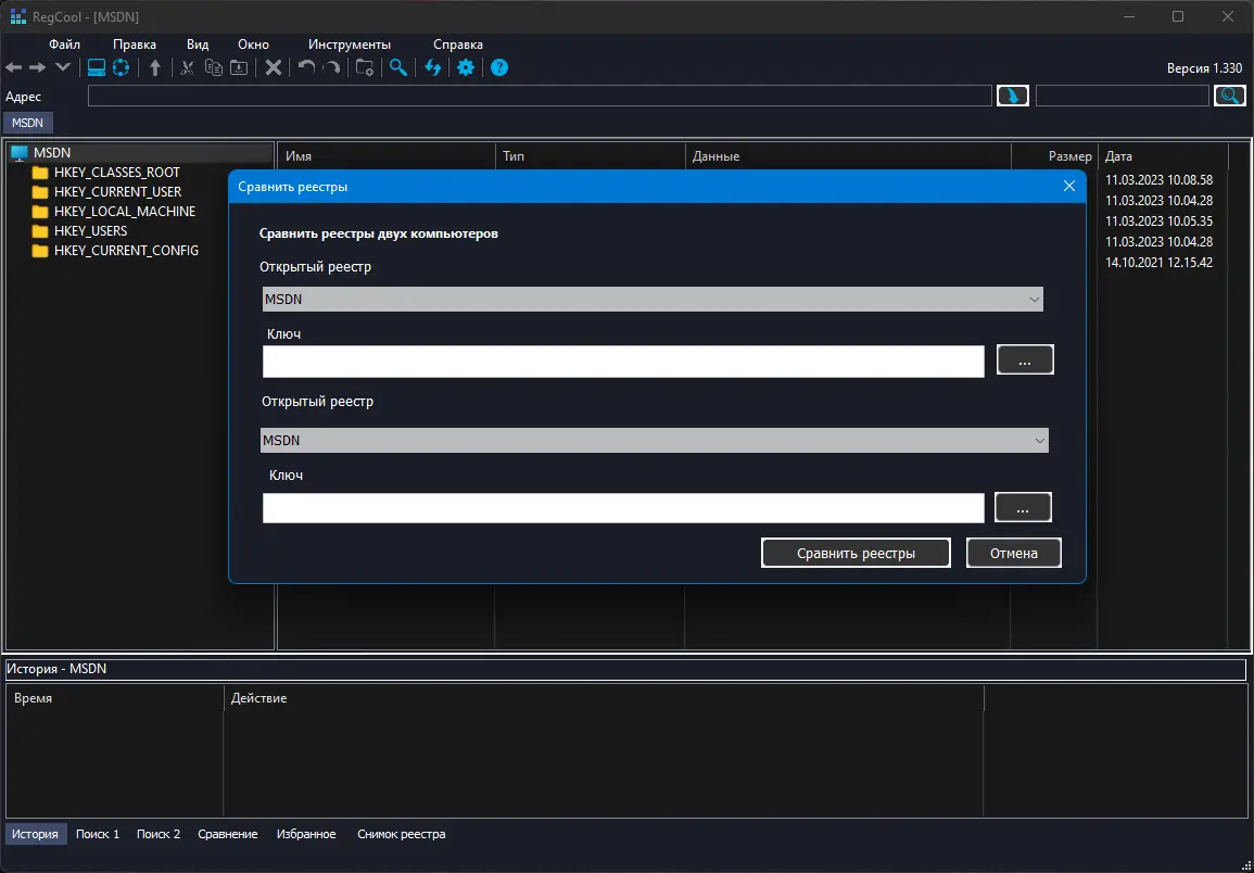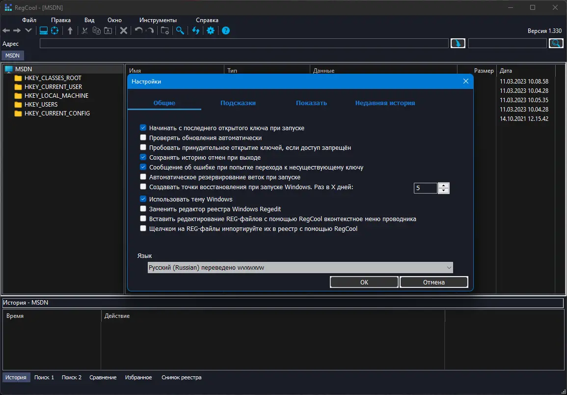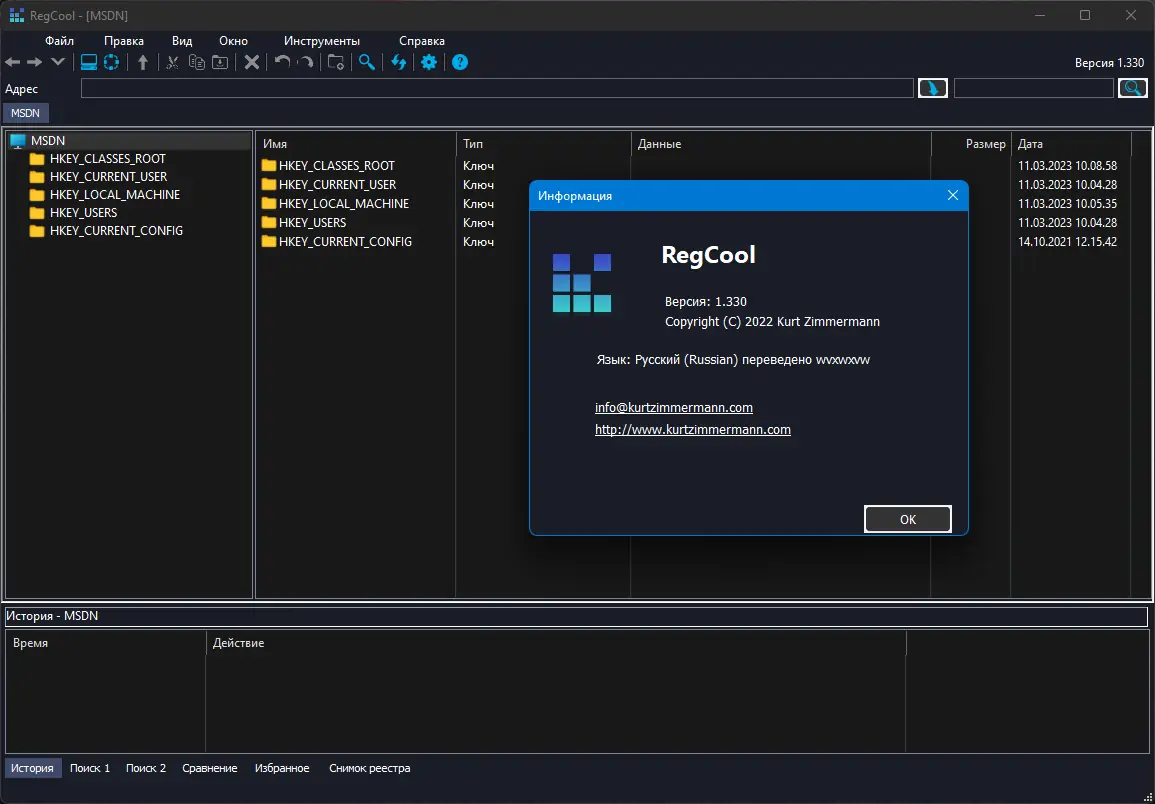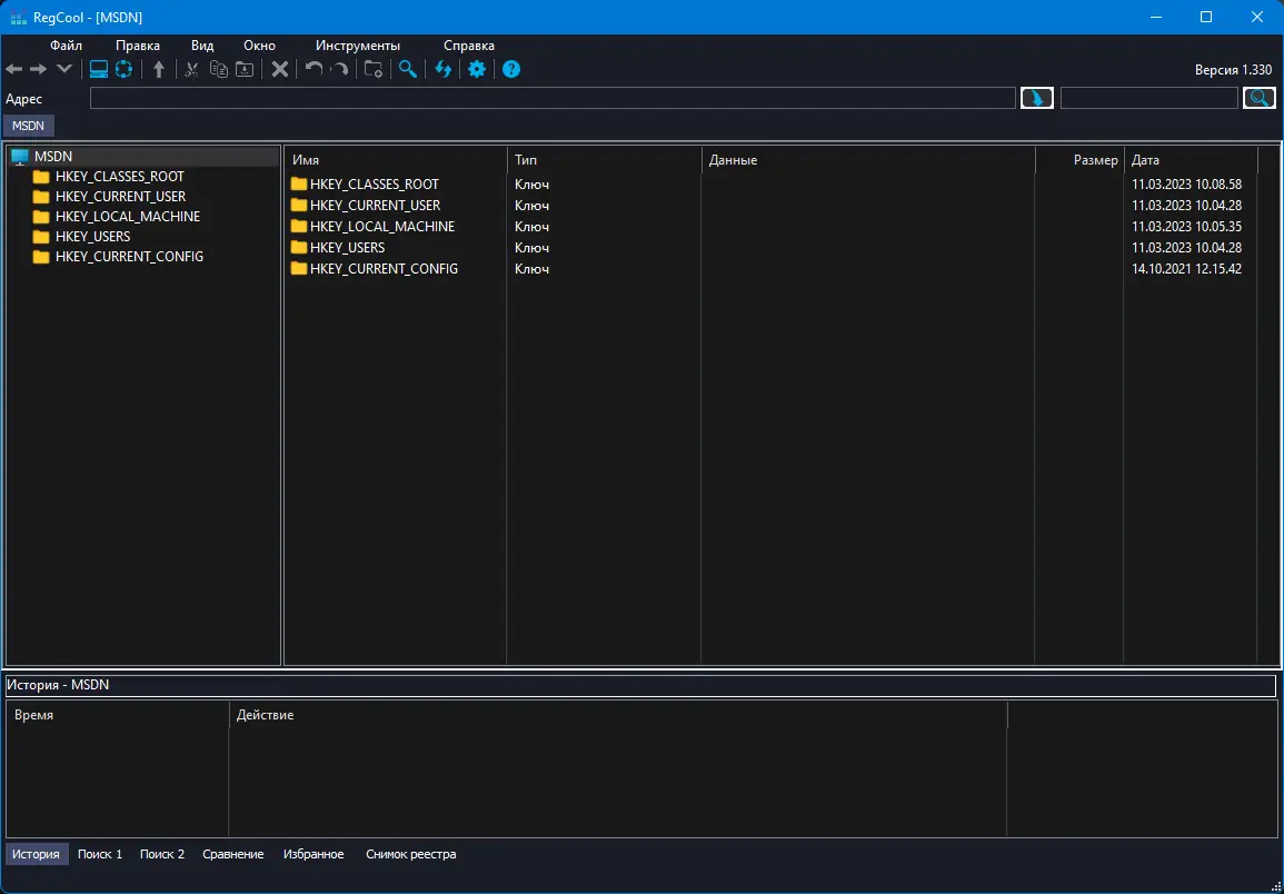 RegCool представляет собой редактор системного реестра с интуитивным интерфейсом, выполненным в стиле Проводника Windows. Программа отличается широким набором функций, которые позволяют быстро и эффективно управлять реестром, включая сравнение двух снимков реестра с отображением всех отличий. Помимо стандартных операций редактирования, таких как копирование, вырезание, вставка, перемещение, удаление и переименование ключей и значений, утилита предлагает возможность редактировать файлы реестра, выполнять импорт и экспорт данных, создавать резервные копии и восстанавливать стабильность системы при необходимости. Важной особенностью является быстротечный поиск информации во всём реестре за считанные секунды, что существенно ускоряет выполнение задач по обслуживанию системы.