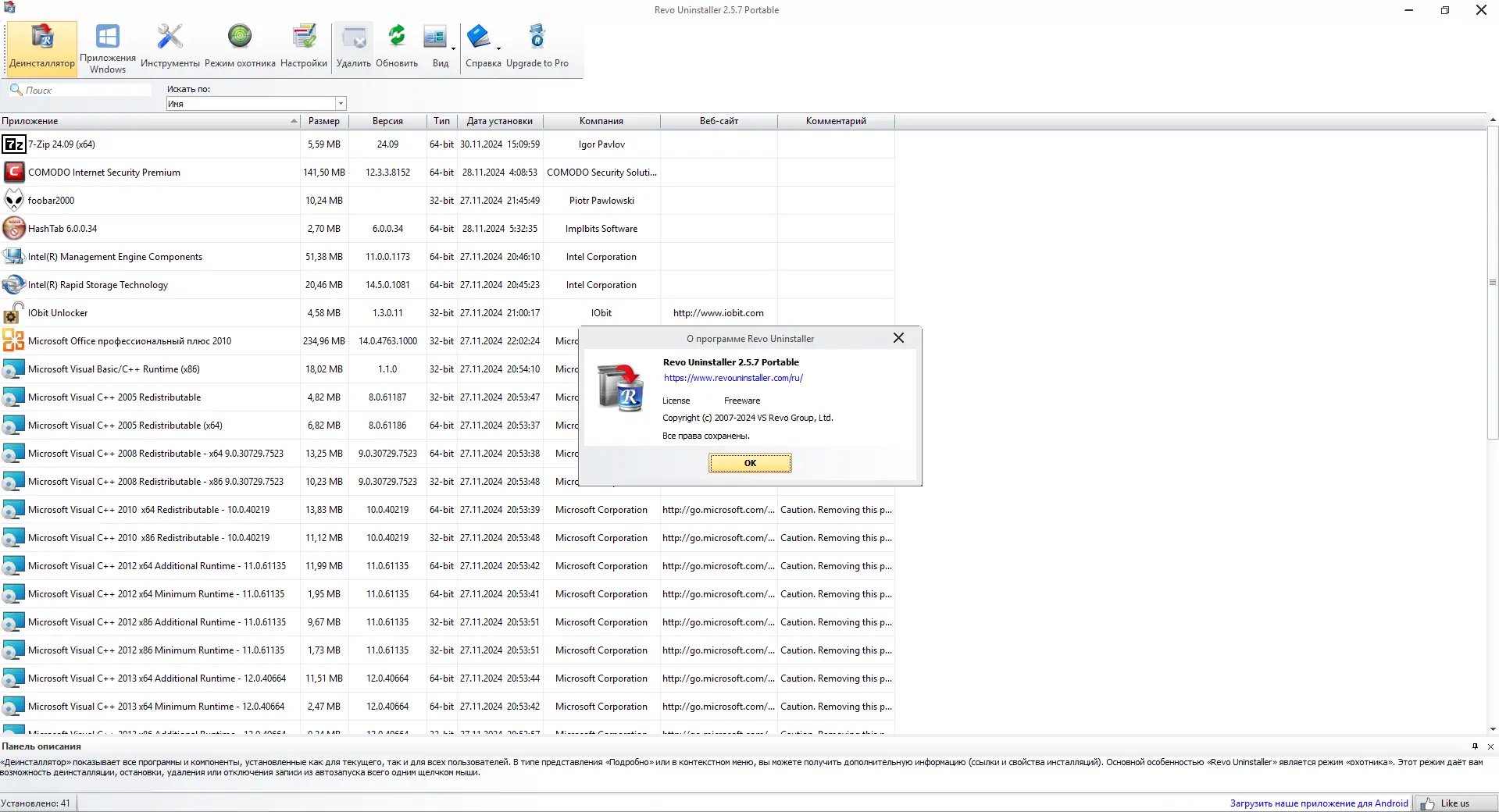 Revo Uninstaller — это продвинутая программа для безупречного удаления нежелательных приложений, установленный на вашем компьютере. Благодаря использованию продвинутого алгоритма сканирования системы до и после установки, она позволяет полностью удалять оставшиеся файлы, папки и ключи реестра после деинсталляции. Уникальный режим «Охотник» обеспечивает удобные инструменты для управления приложениями: их деинсталляции, остановки, удаления и отмены автозапуска. Также программа включает 8 дополнительных утилит для системной очистки и повышения производительности.