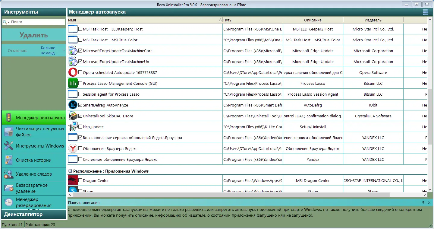 Программа для удаления нежелательных приложений, установленных на вашем компьютере. Она оснащена продвинутым алгоритмом сканирования системы до и после инсталляции, что позволяет эффективно удалять оставшиеся файлы, папки и ключи реестра после деинсталляции. Уникальный режим «Охотник» предлагает простые и эффективные инструменты для управления установленными программами, а также получения информации о запущенных и установленных приложениях. В дополнение, Revo Uninstaller включает шесть дополнительных утилит для очистки системы, обеспечивая полную чистоту вашего ПК.