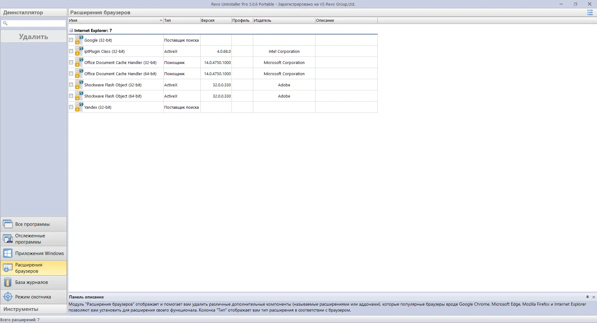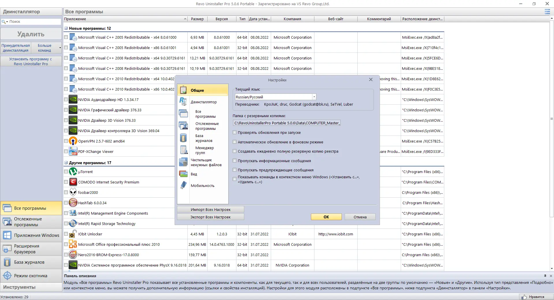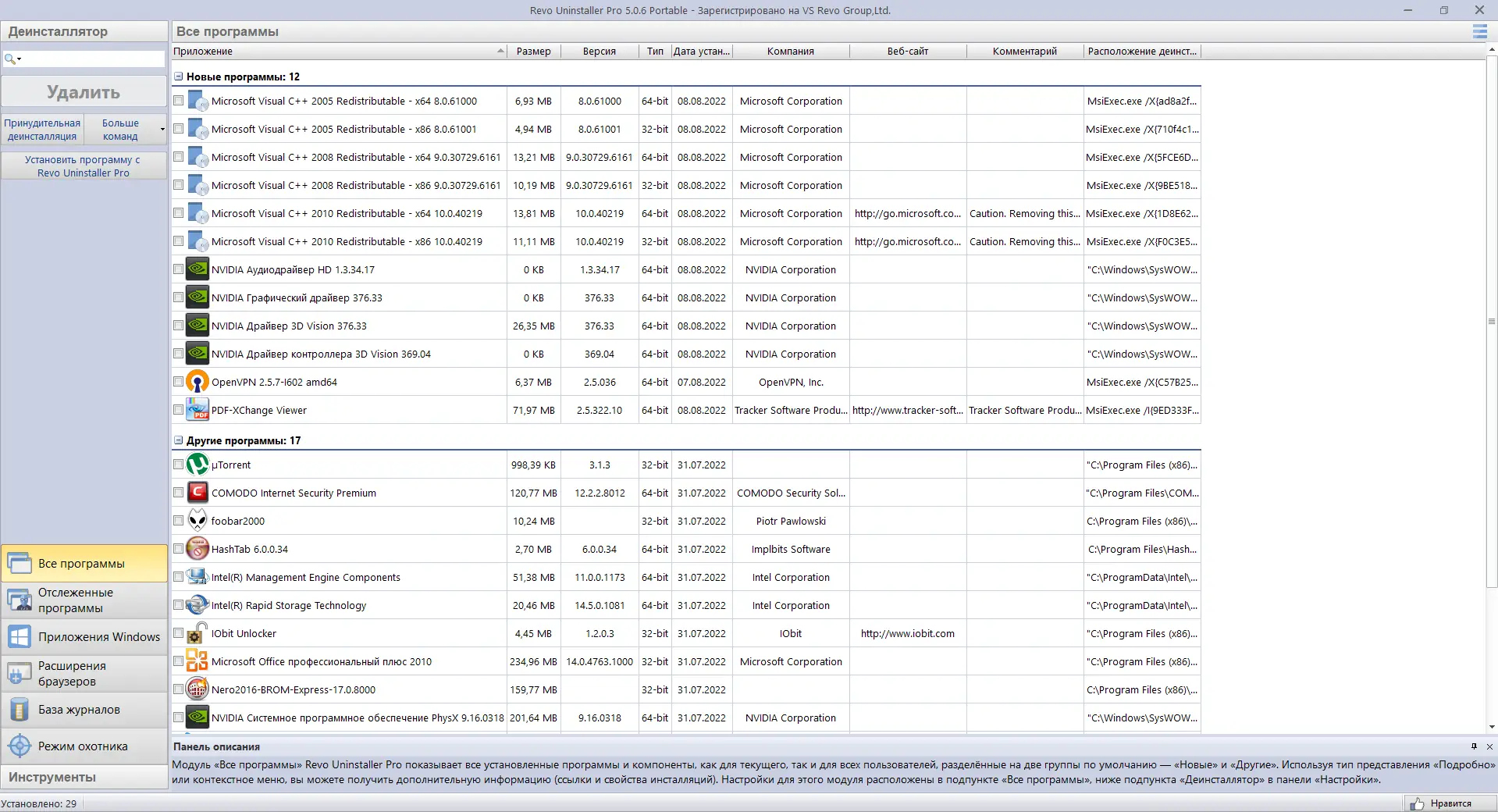 Revo Uninstaller — это мощная утилита, предназначенная для полной деинсталляции программ на компьютере, а также для удаления оставшихся после удаленного софта файлов, папок и ключей реестра. Благодаря продвинутому алгоритму сканирования, программа обеспечивает безопасную и чистую очистку системы. Уникальный режим «Охотник» позволяет легко управлять программами простым наведением мыши и получать информацию о запущенных или установленных приложениях. Кроме того, Revo Uninstaller предлагает несколько утилит для дополнительной системной очистки и оптимизации.