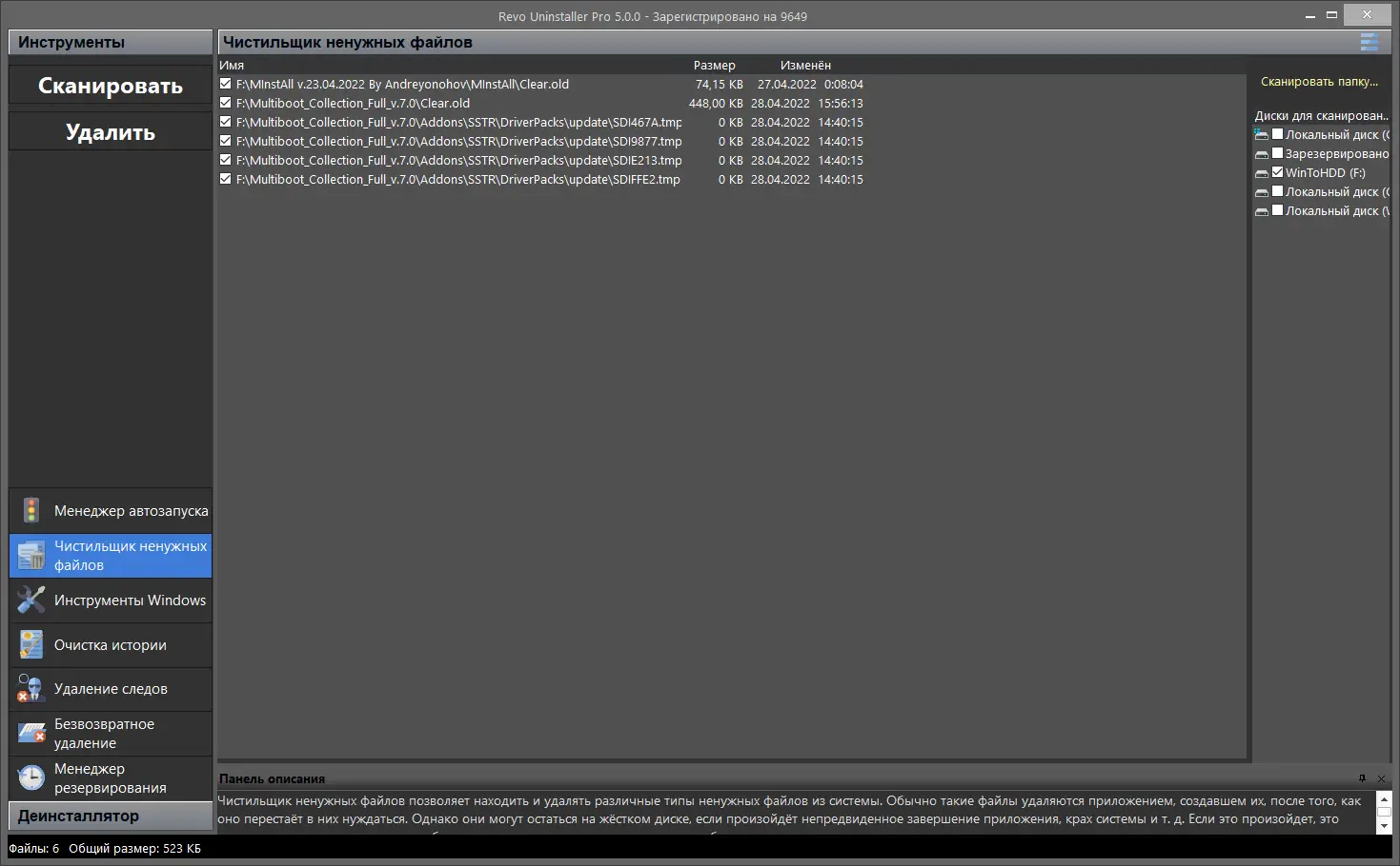 Revo Uninstaller — это профессиональный инструмент для удаления приложений, установленный на вашем компьютере. Он использует продвинутый алгоритм сканирования системы до и после инсталляции, что позволяет полностью удалять оставшиеся файлы, папки и ключи реестра, освобождая место и повышая безопасность системы. Особенностью является уникальный режим «Охотник», который предоставляет простые и эффективные инструменты для управления программами, а также получения подробной информации о текущих запущенных и установленных приложениях. Помимо этого, программа включает в себя восемь дополнительных утилит для удобства очистки системы и повышения её производительности.