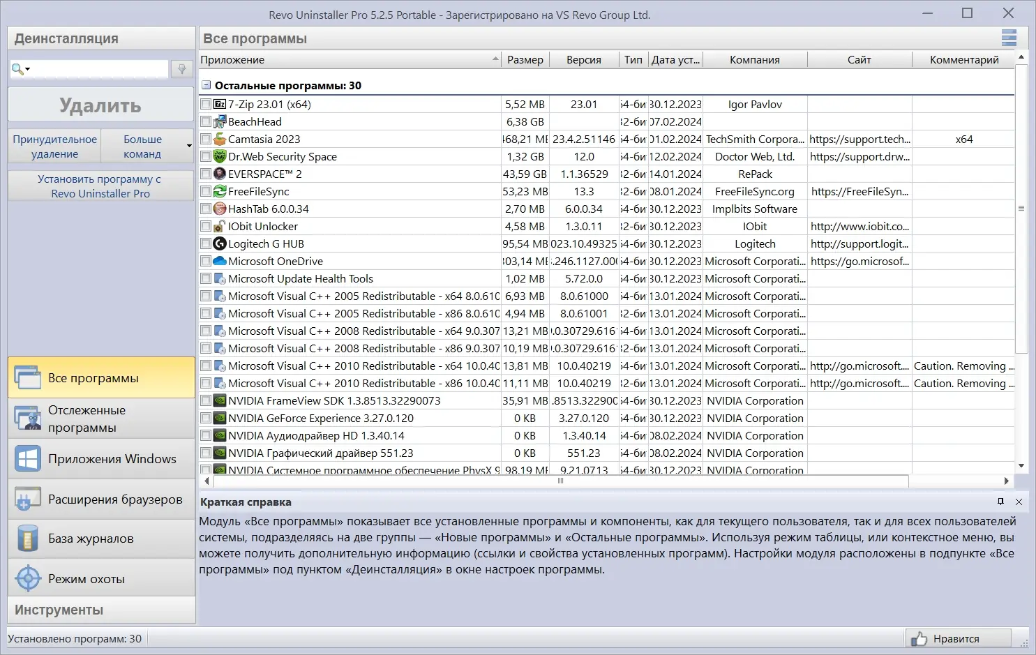 Revo Uninstaller — это мощная программа для удаления нежелательных приложений, установленных на вашем компьютере под управлением Windows. Благодаря продвинутому алгоритму сканирования системы до и после инсталляции, она гарантирует полное удаление программных продуктов и их остатков. Уникальный режим «Охотник» позволяет управлять приложениями простым наведением мыши, а plethora дополнительных утилит помогают поддерживать чистоту системы. Программа подходит для Windows 7, 8/8.1, 10 и 11 на архитектуре x32 и x64 Bit.