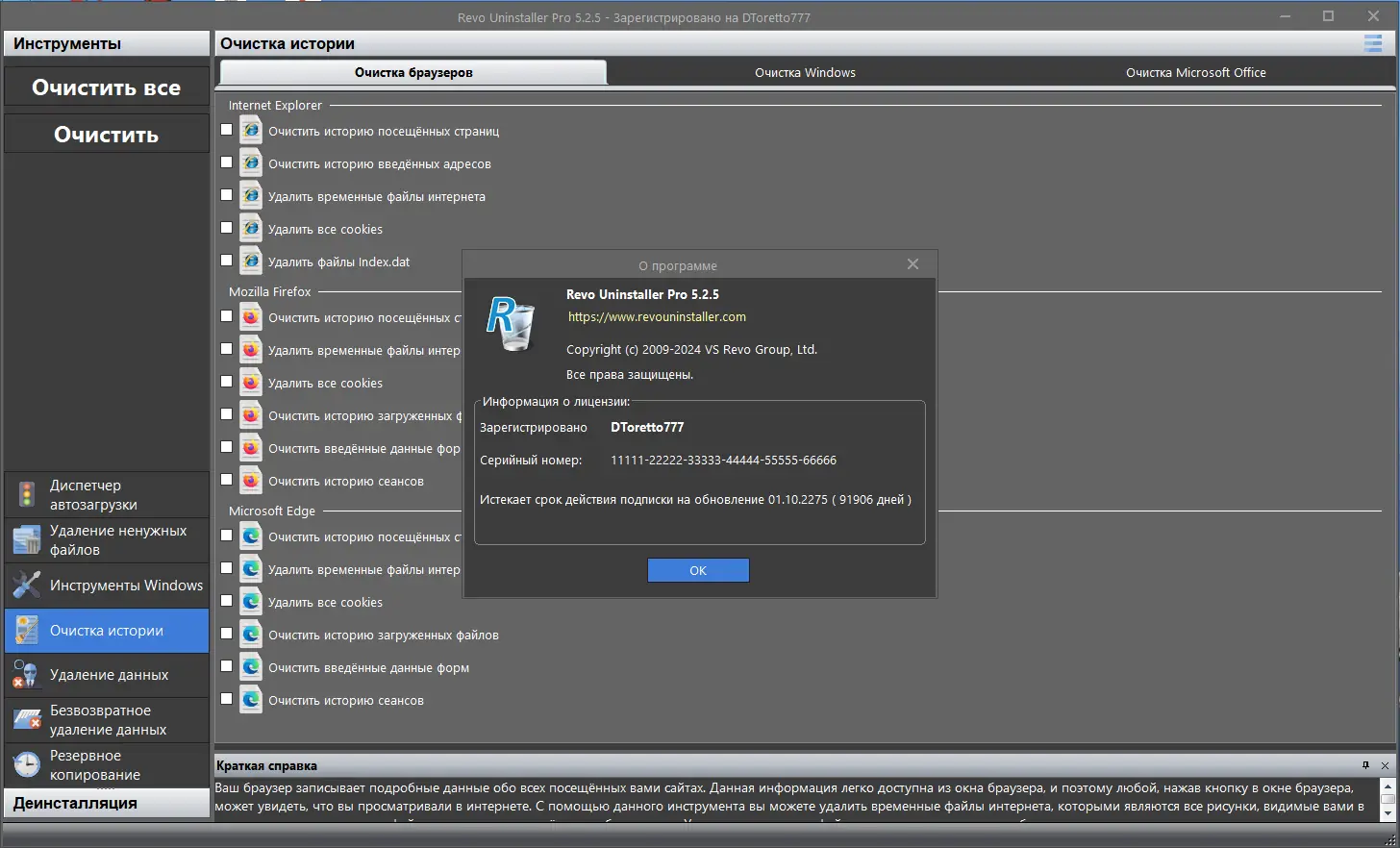 Также Revo Uninstaller имеет инструменты для удаления истории работы в Office, мусорных файлов Windows и доказательств использования, что делает его незаменимым инструментом для пользователей, заботящихся о конфиденциальности. В комплект входит многоуровневая система резервного копирования, что позволяет безопасно удалять программы без риска потерять важные данные или настройки.