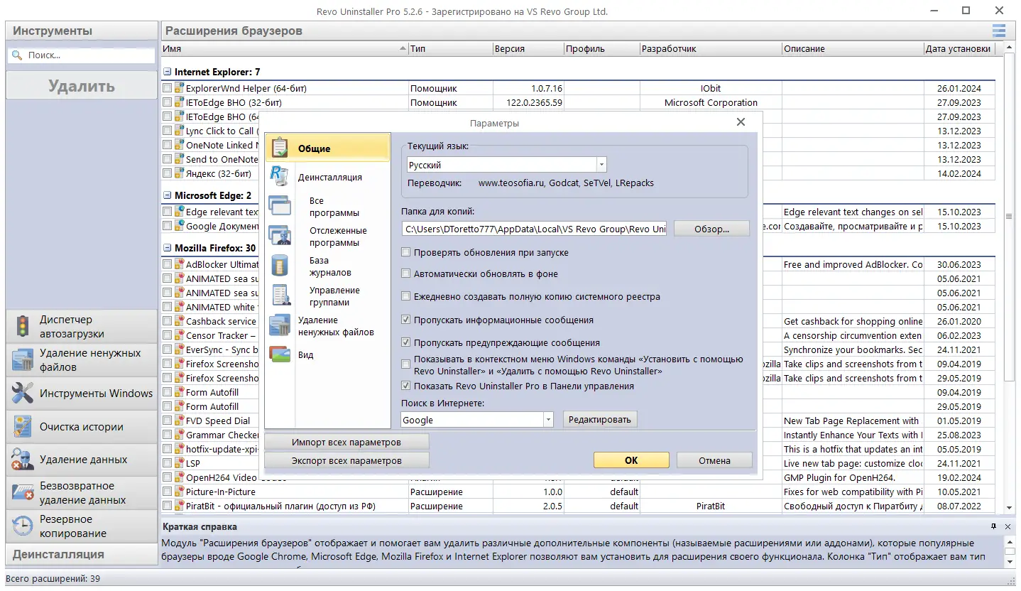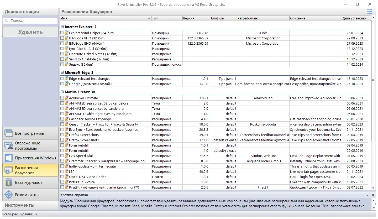 Revo Uninstaller — это мощный инструмент для удаления установленных на компьютере приложений. Он использует продвинутый алгоритм сканирования системы до и после удаления, что позволяет находить и устранять даже самые скрытые файлы, папки и ключи реестра, оставшиеся после стандартных способов удаления. В режим «Охотник» встроена уникальная функция управления приложениями — простое наведание курсора позволяет деинсталлировать, останавливать или удалять автозагрузку программ. Дополнительно программа включает 8 утилит для системной очистки и оптимизации, что делает её незаменимым инструментом для поддержания чистоты и скорости работы ПК.