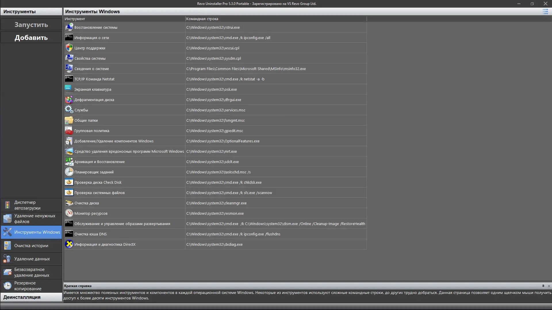 Revo Uninstaller — мощная программа для полного и безопасного удаления нежелательных приложений, установленного софта, а также очистки остатков после их деинсталляции. Обладая продвинутым алгоритмом сканирования системы до и после установки, она позволяет удалять файлы, папки и ключи реестра, которые обычно остаются после стандартных методов удаления. Уникальный режим «Охотник» обеспечивает удобное управление программами — удаление, остановка, отмена автозапуска — простым наведением курсора на иконку. В составе программы представлены ещё 8 универсальных утилит для поддержания чистоты системы и её быстродействия.