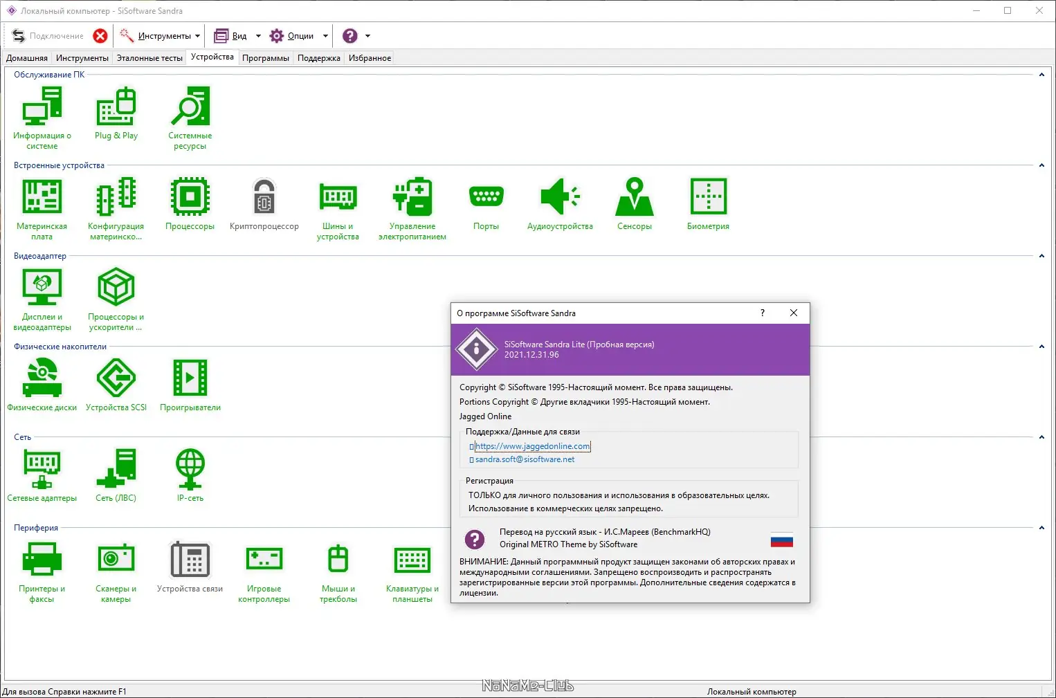 SiSoftware Sandra Lite — это бесплатная версия комплексной программы для анализа, диагностики и тестирования компьютера и его компонентов. Она предоставляет расширенную информацию о системной плате, процессоре, комплектующих и периферийных устройствах. Благодаря инструментам программы можно не только получить подробную техническую характеристику, но и провести различные тесты производительности и диагностики. Это облегчает оценку вычислительных возможностей системы, проверку стабильности и сравнение результатов с другими конфигурациями.
