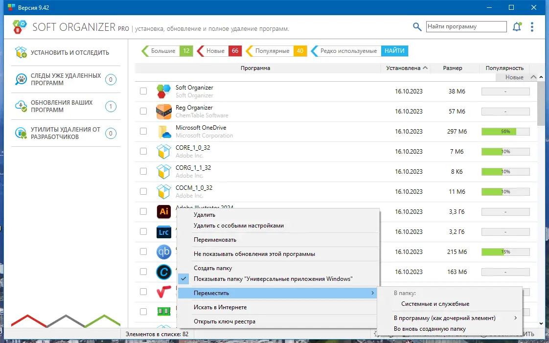 Дополнительно, Soft Organizer отслеживает все изменения, происходящие при установке программ, чтобы в дальнейшем обеспечить их полное удаление. Благодаря этому утилита позволяет не только своевременно избавляться от ненужных приложений, но и искать остатки уже удалённых программ, а также управлять обновлениями и установками с отслеживанием изменений, что значительно упрощает работу с ПО на вашем ПК.
