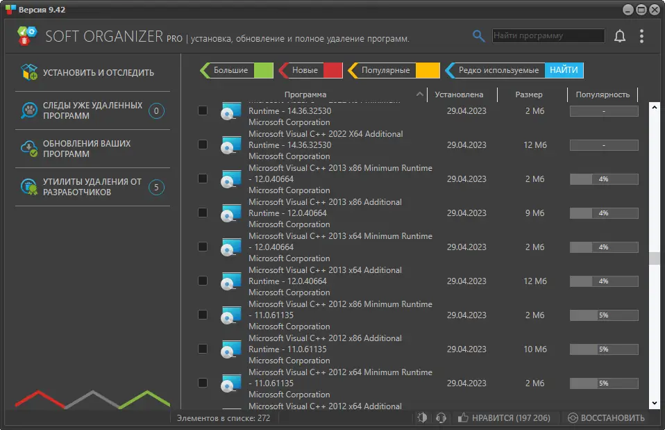 Soft Organizer — это мощная утилита для полного удаления нежелательных программ из системы, которая помогает избавиться от остатков файлов, записей в реестре и других следов установленных приложений. Программа обеспечивает высокую скорость работы за счет анализа изменений в реальном времени во время установки программ, позволяя точно определить все связанные с ними компоненты и полностью их удалить. Это особенно важно для поддержания чистоты и стабильности системы, а также для освобождения дискового пространства. Soft Organizer удобна в использовании и не требует дополнительных навыков для проведения очистки.