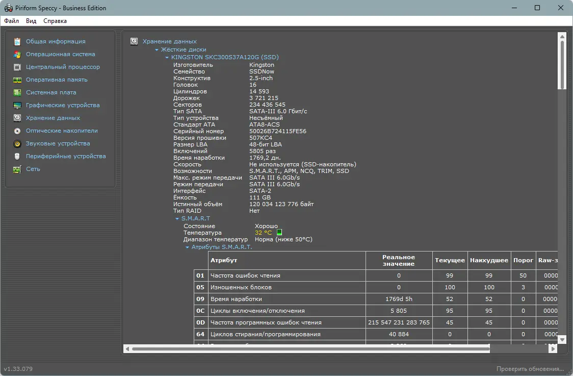 - Информация о жёстких дисках: производитель, интерфейс, объём и файловая система.