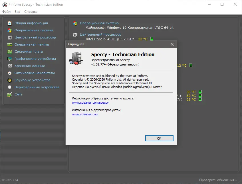 Speccy — небольшая утилита, разработанная компанией создателей популярного очистителя системы CCleaner. При запуске она мониторит аппаратную составляющую компьютера и отображает актуальные сведения об операционной системе, процессоре, оперативной памяти, жестком диске, материнской плате, видеоадаптере и других компонентах. Помимо этого, программа показывает температурные показатели CPU и видеокарты, рабочую частоту RAM и скорость шины процессора, что важно для контроля состояния железа и диагностики возможных проблем.