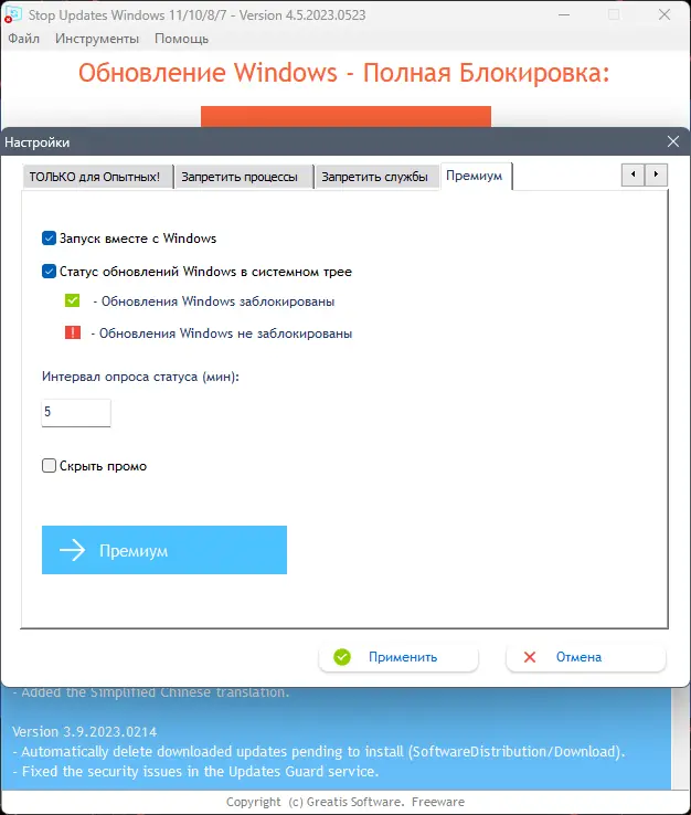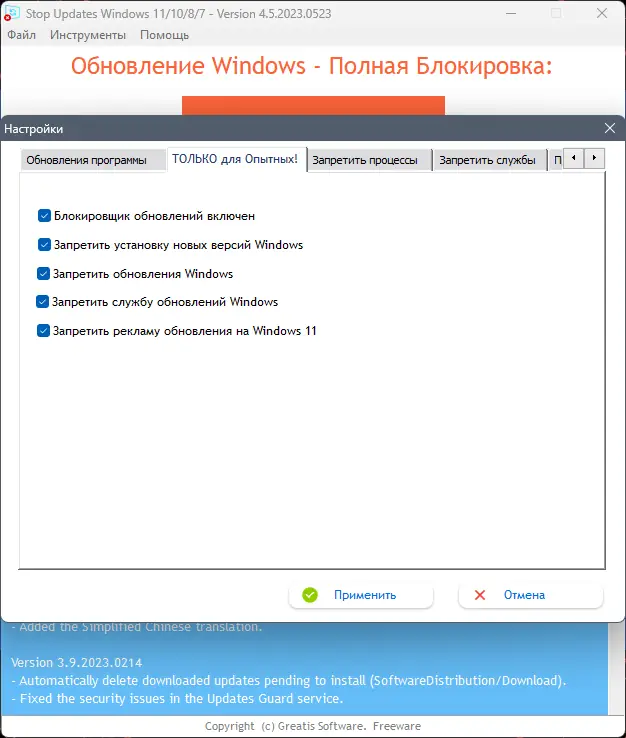 - Блокировка нежелательных уведомлений о доступных обновлениях