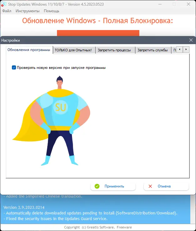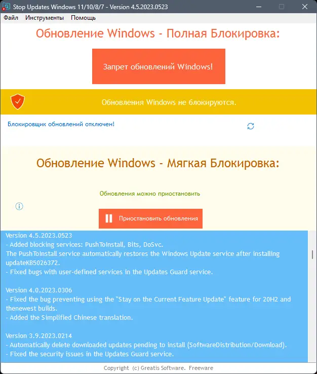 Обратите внимание, что программа не удаляет системные файлы и не влияет на работу других служб, что делает её безопасным инструментом для временного отключения обновлений.