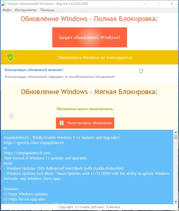 StopUpdates – бесплатная утилита для Windows 10 и Windows 11, предназначенная для блокировки обновлений системы. Она позволяет пользователю самостоятельно контролировать процесс обновления и предотвращать нежелательные изменения системы.