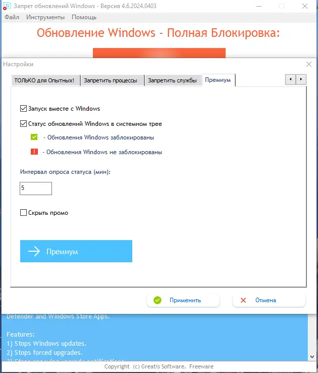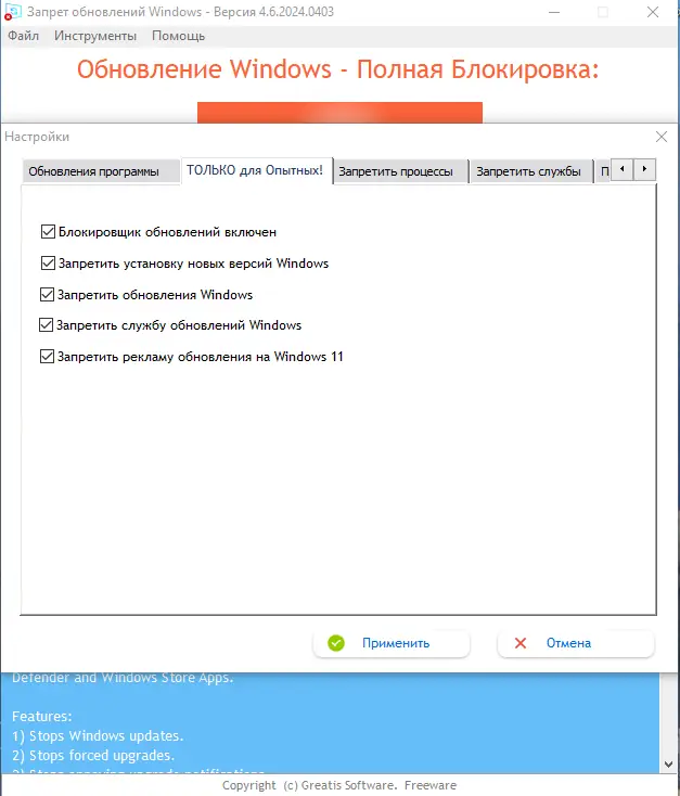 - Выберите необходимые параметры блокировки обновлений и подтвердите операции.