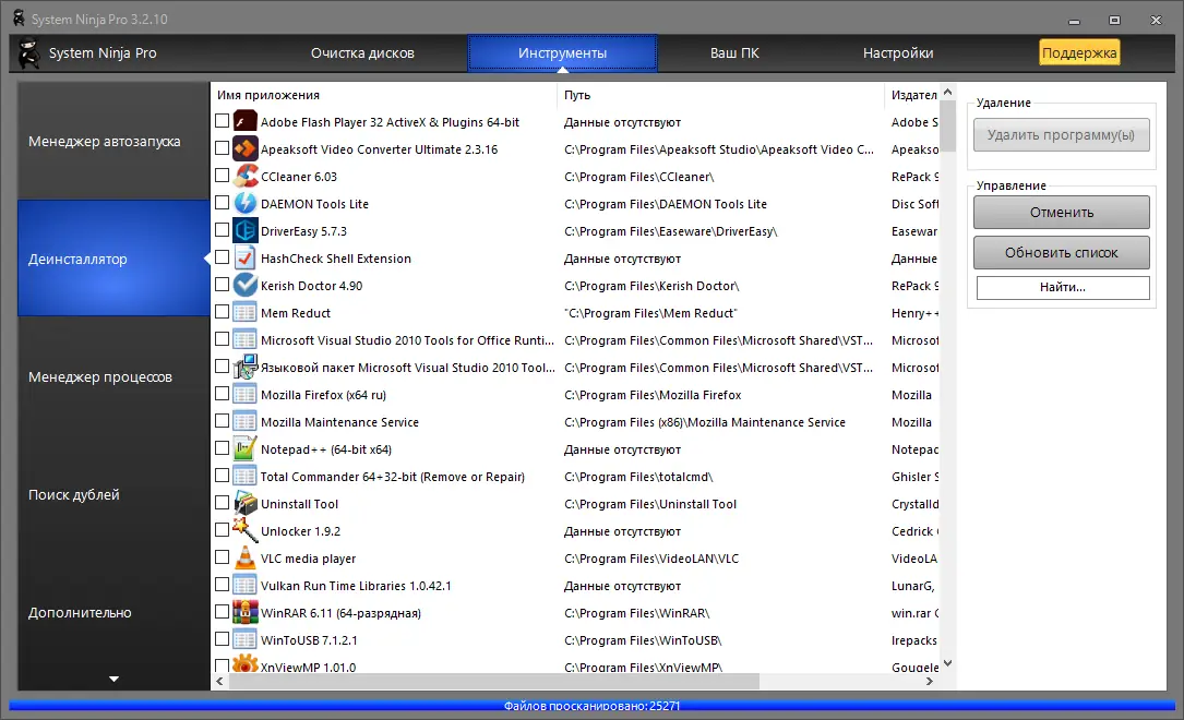 - Деинсталлятор для удаления приложений с полной очисткой