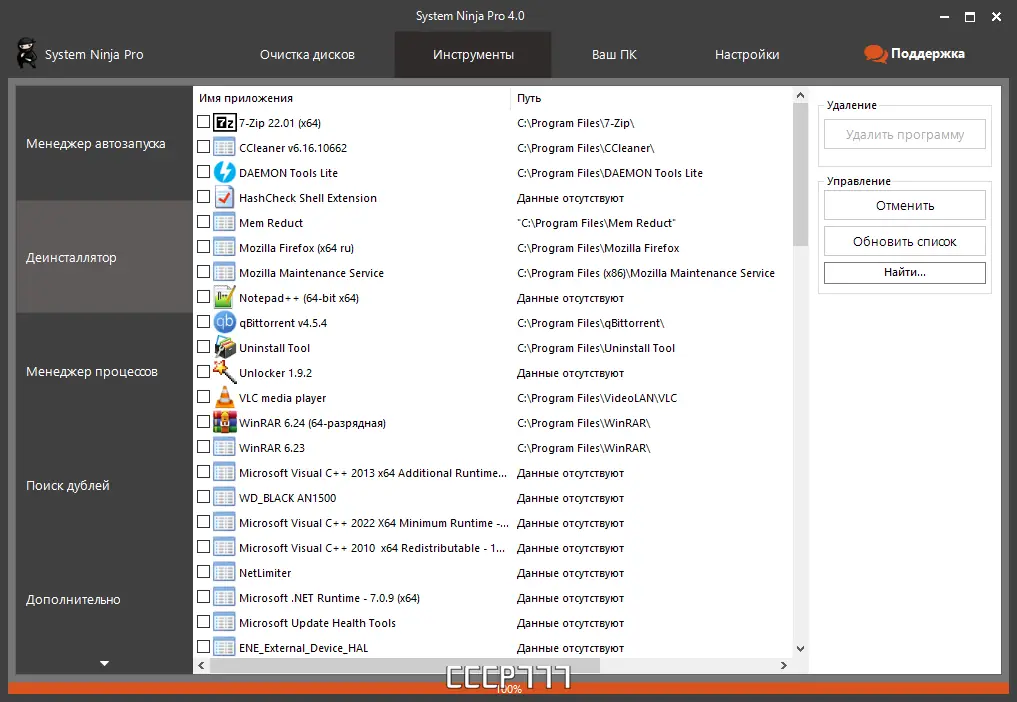 System Ninja — это быстрое и эффективное решение для оптимизации ПК на базе ОС Microsoft Windows. Программа предназначена для аккуратного удаления файлового «мусора», повышения скорости системы и устранения различных проблем. Одной из ключевых особенностей является поиск «мусора» по всей файловой системе, что позволяет проводить тщательное очищение. После сканирования пользователю предоставляется подробный отчет со всей информацией, чтобы он мог самостоятельно решить, что оставить, а что удалить. Удобный интерфейс упрощает настройку параметров сканирования, а включенные инструменты, такие как менеджер автозапуска, деинсталлятор или поиск дубликатов, делают утилиту универсальным средством для обслуживания системы.