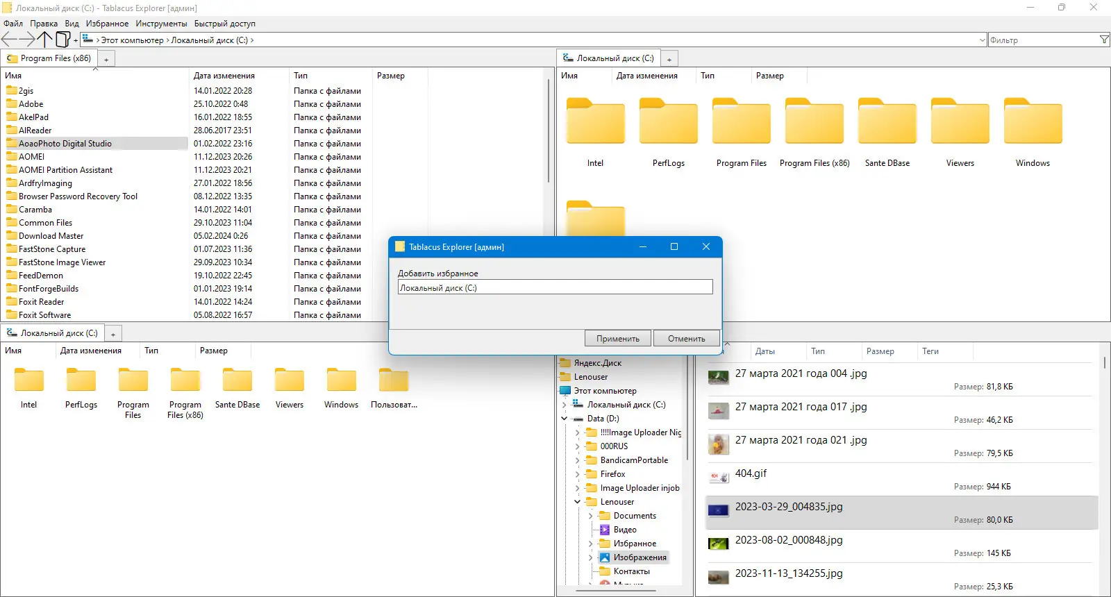 Tablacus Explorer — мощный и легкий в использовании файловый менеджер, который позволяет работать с двумя или четырьмя панелями и создавать неограниченное количество вкладок для облегчения навигации. В отличие от стандартного проводника Windows, программа дублирует все его функции, дополняя их удобным интерфейсом и расширенными возможностями. Утилита значительно упрощает процессы копирования, перемещения, удаления и переименования файлов и папок. Среди преимуществ — поддержка дополнительных расширений (Add-ons), таких как Жесты мыши, Горячие клавиши, Буфер обмена и Избранное, что делает работу еще более эффективной. Благодаря своему небольшому размеру и портативной природе, Tablacus Explorer не требует установки и может быть использован на любом компьютере с Windows 7, 8/8.1, 10 или 11, поддерживая системы x32/x64 Bit.