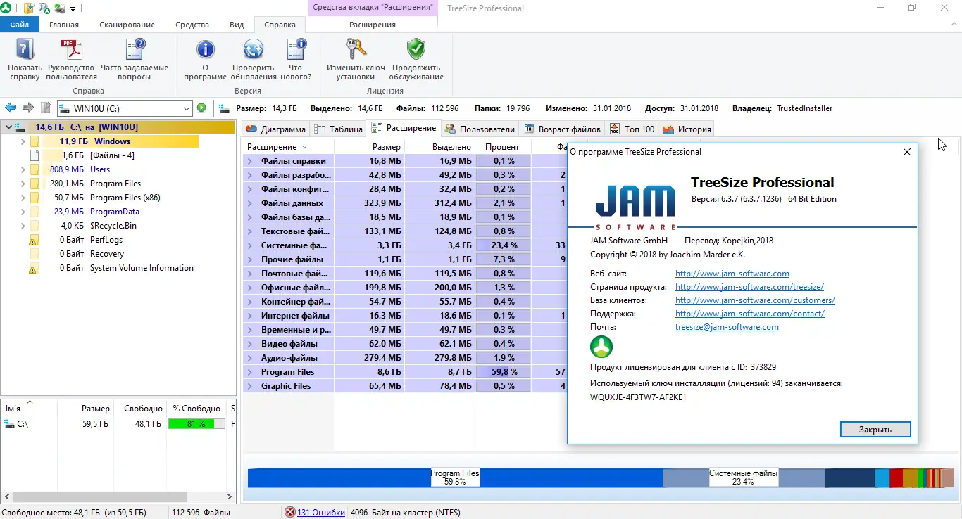 Для установки TreeSize просто запустите соответствующий файл для вашей системы. Перед началом убедитесь, что выбираете правильную разрядность — 32 или 64 бит. В случае необходимости русификации запустите файл локализации. Если программа уже зарегистрирована или вы используете портативную версию, регистрация не требуется.