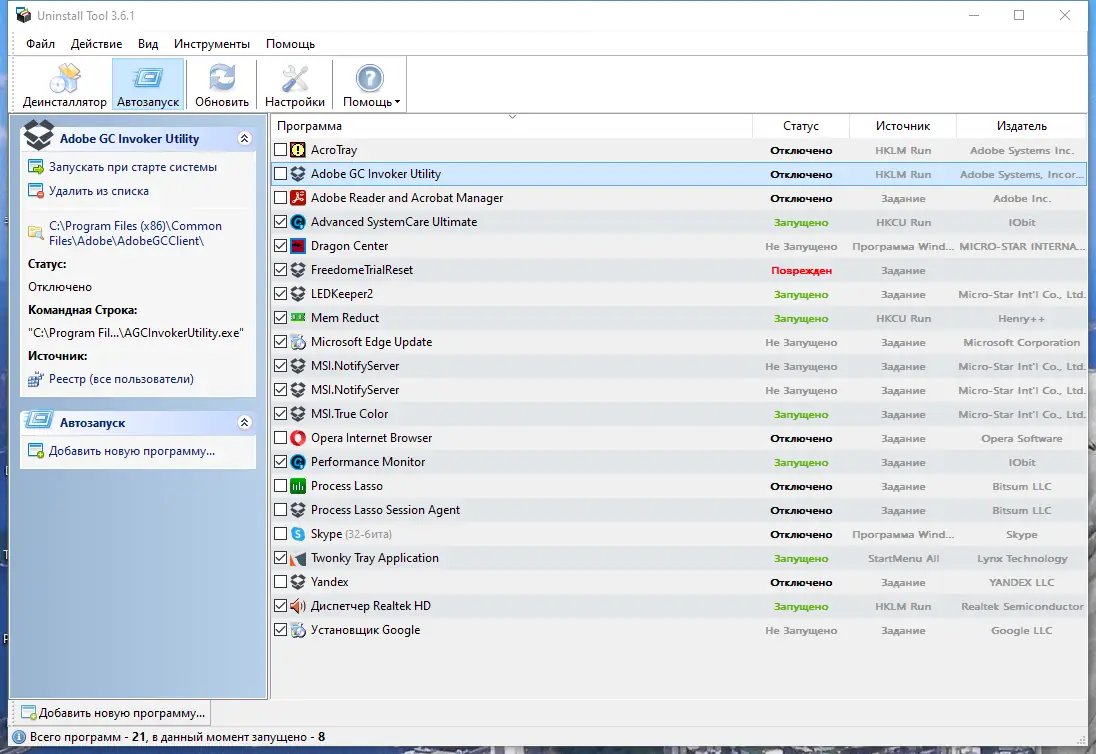 - Работа с программами автозагрузки: включение, отключение, удаление и просмотр детальной информации