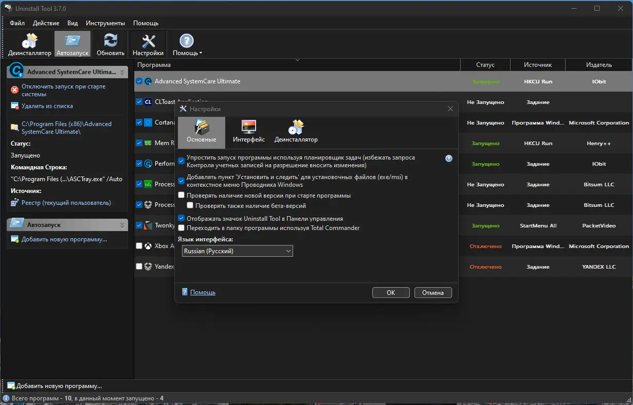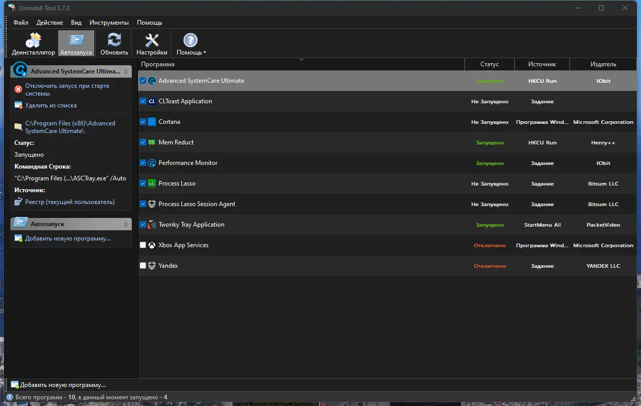 - Управление программами автозагрузки: добавление, удаление, отключение