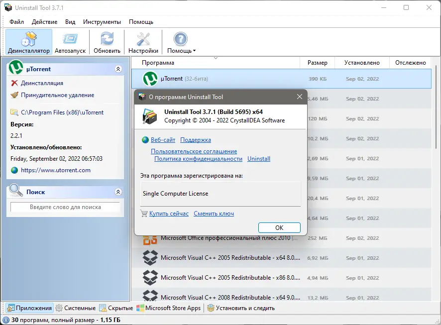 Uninstall Tool — это быстрая, мощная и надежная альтернатива системному апплету «Установка и Удаление программ». Эта программа обеспечивает безопасное и удобное удаление ненужных приложений, повышая эффективность работы вашего компьютера. Она умеет находить скрытые установленные программы, сортировать список по заданным фильтрам, удалять некорректно инсталлированные или уже деинсталлированные программы, а также экспортировать список установленных приложений в HTML-отчет.