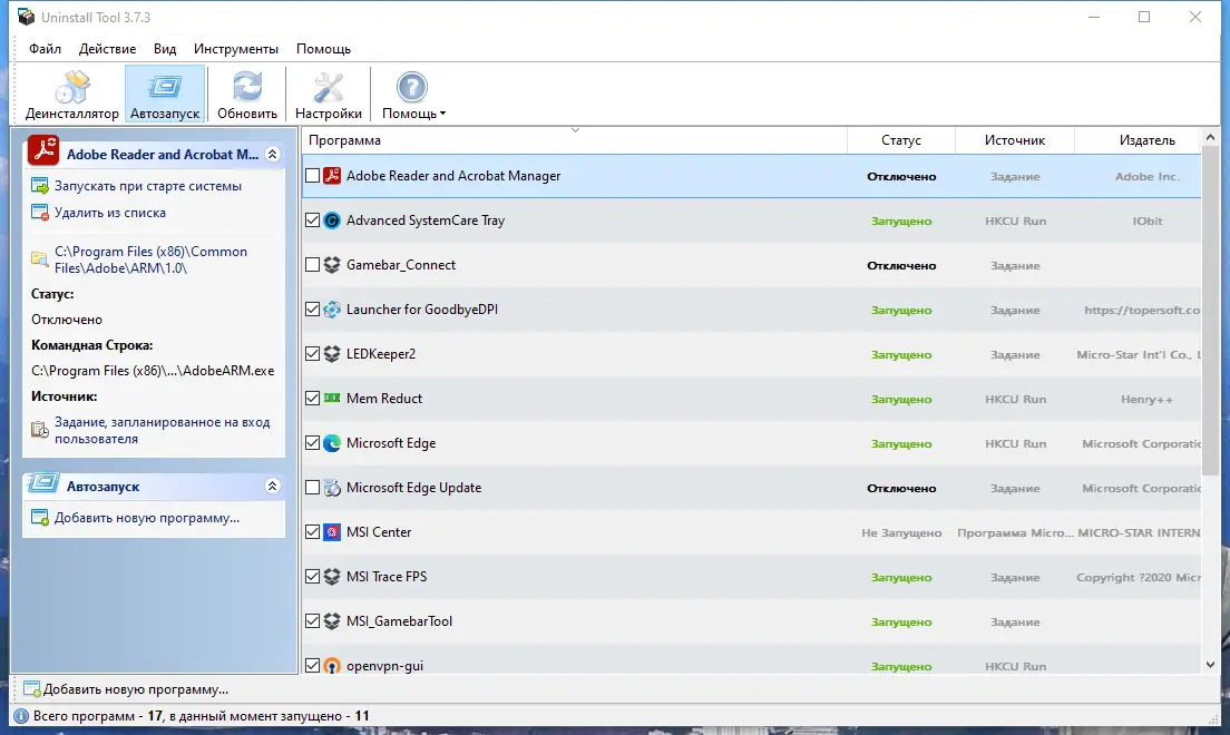 - Редактирование автозагрузки — добавление, удаление и отключение программ