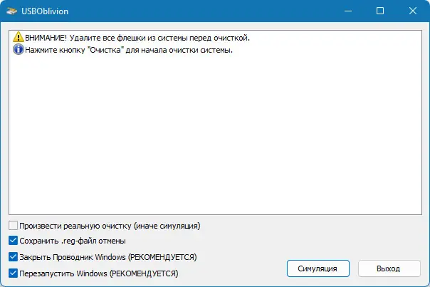 USB Oblivion — универсальная портативная утилита, предназначенная для безопасного и быстрого стирания следов подключения USB-устройств, таких как флешки, внешние диски и CD-ROM. Поддерживая работу на различных версиях Windows — от Windows XP до Windows 11 (x32/x64 Bit), программа помогает предотвращать возможные следы подключения устройств в реестре системы. Встроенные режимы тестирования и автоматической работы обеспечивают гибкое использование и безопасность при выполнении очистки.