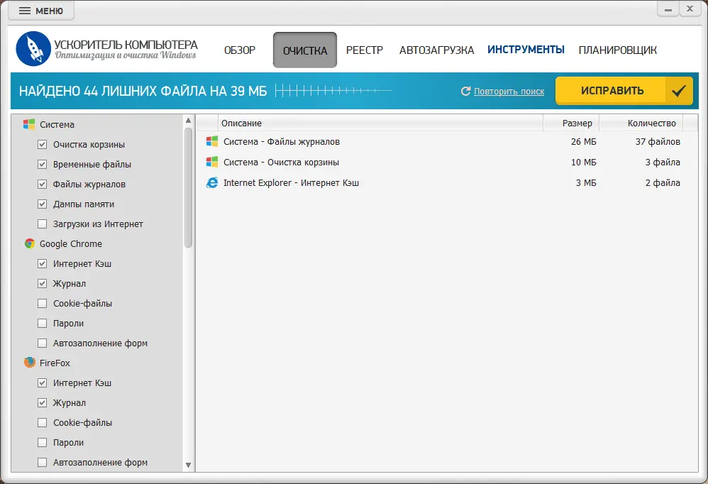 Ускоритель Компьютера — это удобное и простое в использовании решение для поддержания производительности вашего компьютера. В процессе работы операционная система со временем накапливает лишние файлы, временные данные, устаревшие записи в реестре и другие виды мусора. Всё это замедляет работу ПК, вызывает сбои и ошибки. Чтобы избежать ухудшения производительности и обеспечить стабильную работу, необходимо регулярно проводить очистку и оптимизацию системы. Программа Ускоритель Компьютера позволяет автоматизировать эти процессы, упрощая их выполнение даже для пользователей без специальных знаний. Инструмент быстро анализирует систему, показывает отчёт и предлагает исправить найденные ошибки одним нажатием.