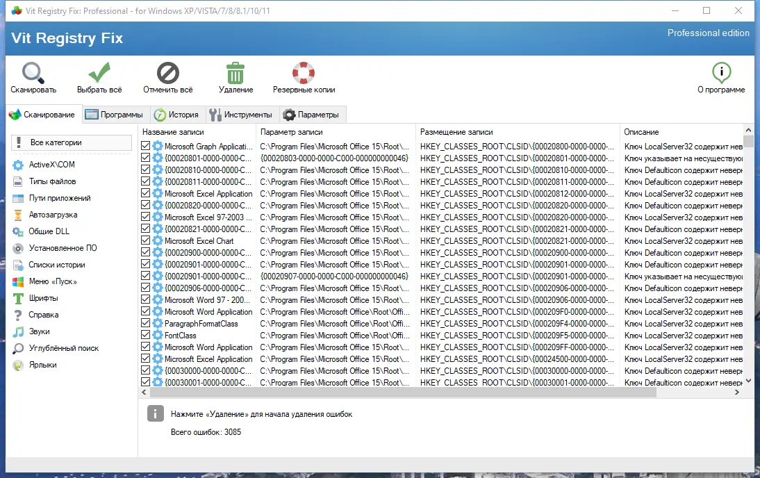 - Мощный автоматический поиск ошибок и оптимизация реестра