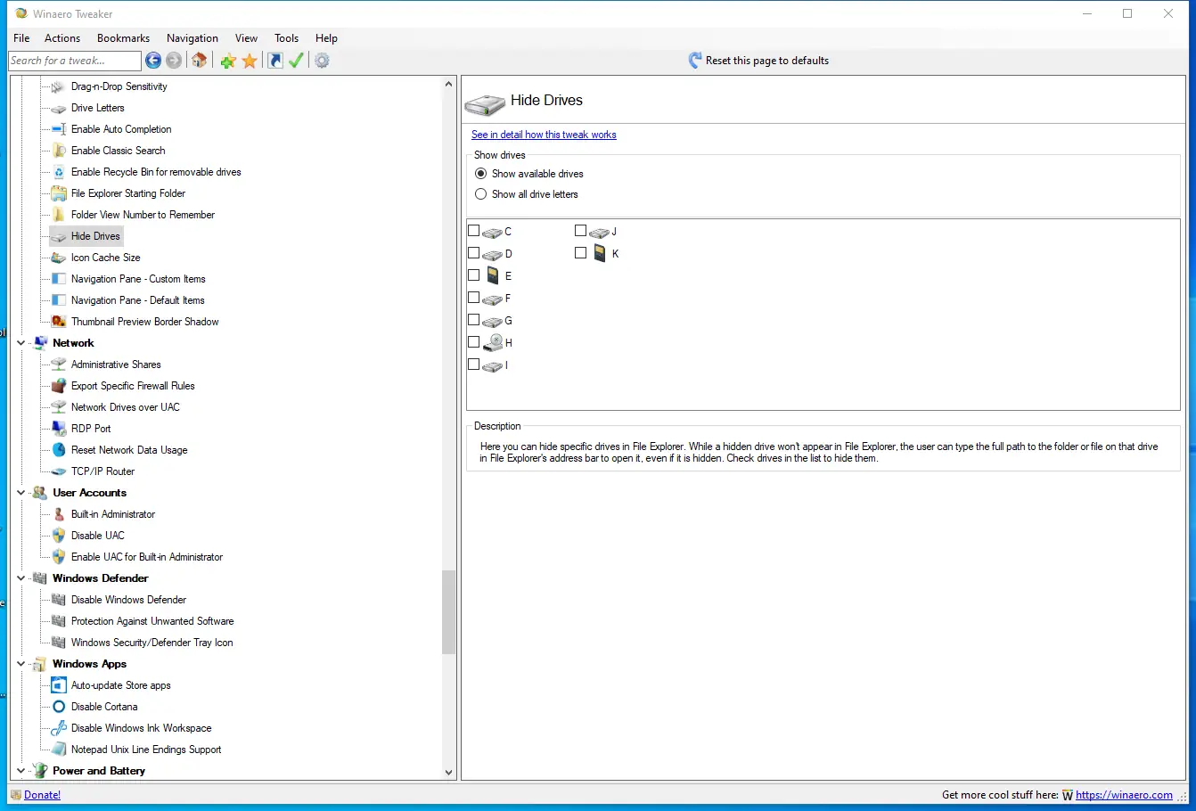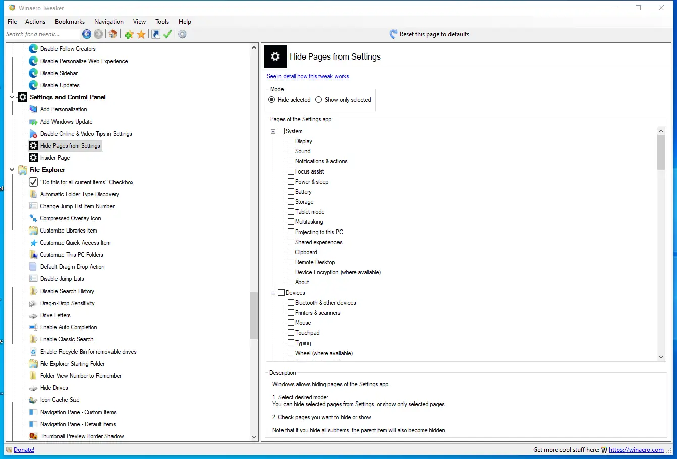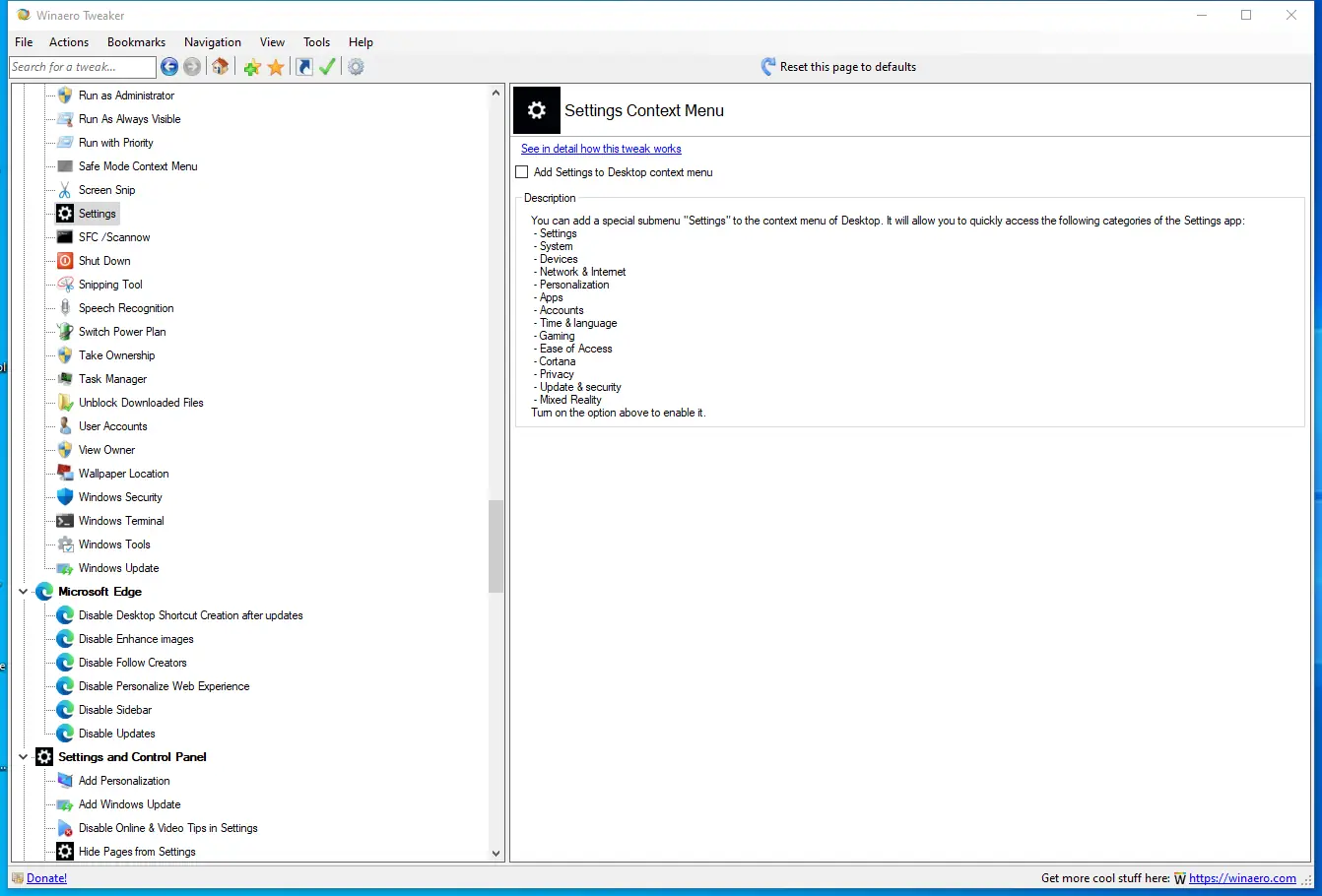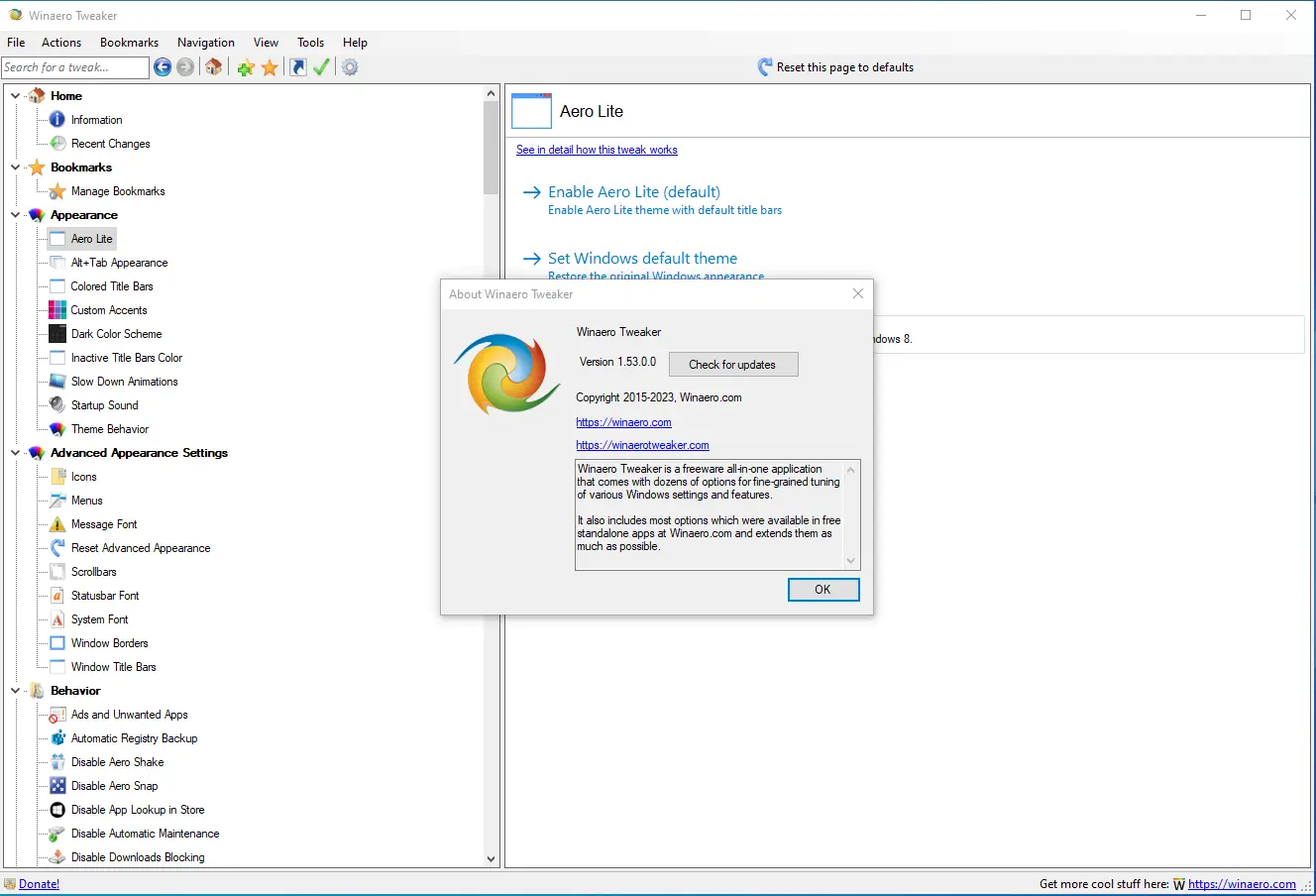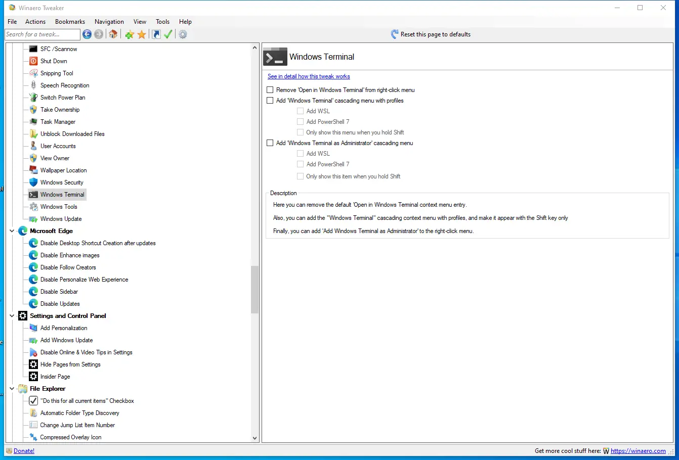 Winaero Tweaker — бесплатная системная утилита для тонкой настройки и оптимизации интерфейса операционных систем семейства Windows, включая версии 7, 8/8.1, 10 и 11. Обеспечивает расширенные возможности по изменению внешнего вида и поведения системы без необходимости глубокого вмешательства в системные файлы.