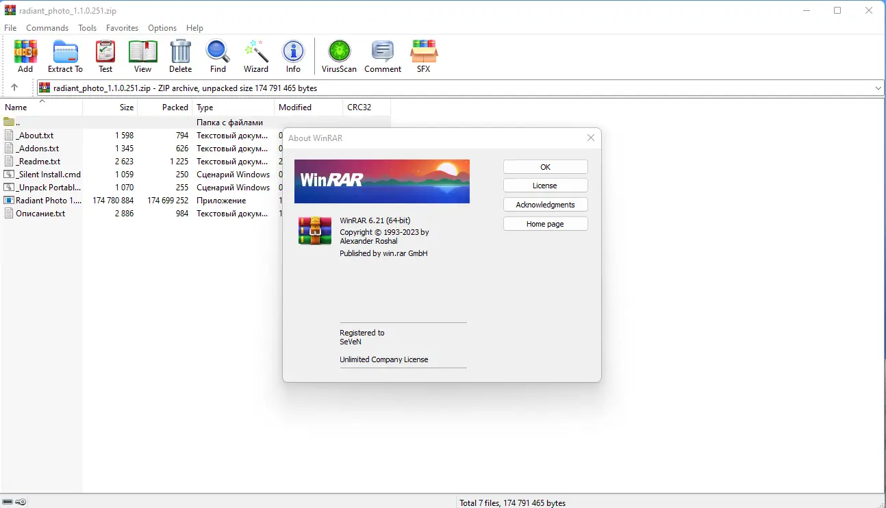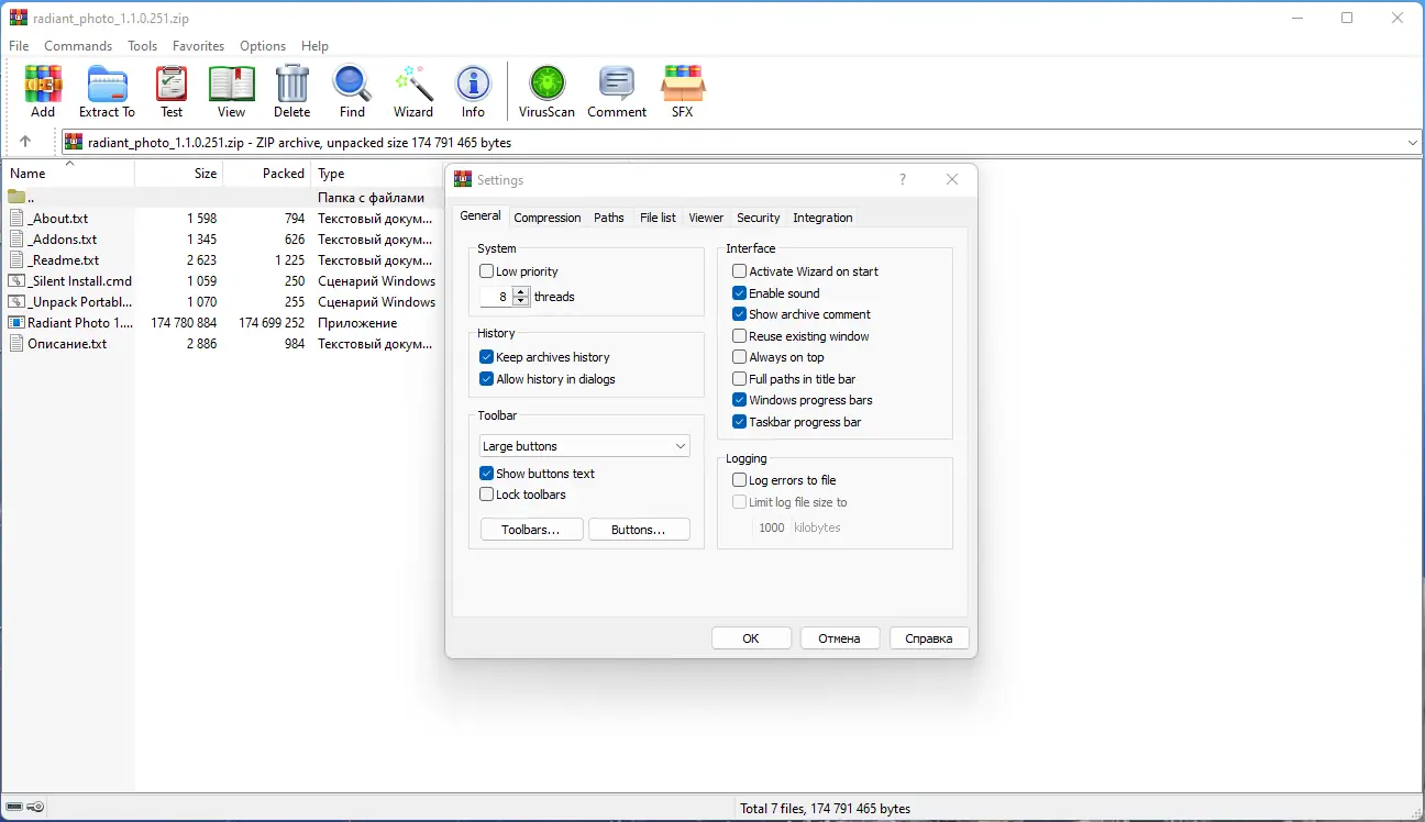 WinRAR – один из самых популярных архиваторов, широко используемый для сжатия и распаковки различных форматов архивов. Он отлично справляется с архивацией в формате RAR, а также поддерживает работу с ZIP, CAB, ARJ, LZH, TAR, GZ, BZIP, JAR, UUE, GZIP, BZIP2 и 7-Zip. Программа обладает множеством полезных возможностей, таких как шифрование данных, поддержка многотомных и непрерывных архивов, а также специальный алгоритм для сжатия мультимедийных файлов, что позволяет добиться степени сжатия на 10 – 50% выше по сравнению с обычными методами.