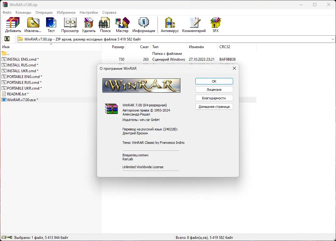 WinRAR — мощное программное обеспечение для архивирования данных, поддерживающее архивацию в форматах RAR и ZIP, а также работу с архивами CAB, ARJ, LZH, TAR, GZ, BZIP, JAR, UUE, GZIP, BZIP2, 7-Zip и другими. Программа обладает многочисленными возможностями, включая шифрование, поддержку многотомных и непрерывных (solid) архивов, специальные алгоритмы для мультимедийных файлов и создание самораспаковывающихся архивов. Она обеспечивает максимально эффективное сжатие данных, что позволяет уменьшить объем файлов до 10-50% по сравнению с обычными методами. Благодаря интуитивному интерфейсу с поддержкой drag & drop, а также командной строке, использование становится максимально удобным для пользователей разных уровней.