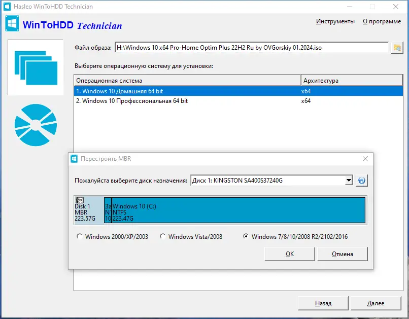 WinToHDD предоставляет возможность установить или переустановить Windows 10/8.1/8/7, загрузившись с ISO файла, а также клонировать системный раздел для быстрого переноса операционной системы на другой диск. В процессе работы программа не требует наличия установочных дисков или флешек — всё делается через подключение ISO-образа и выбор целевого раздела. Установить операционную систему на нужный диск можно даже на работающем компьютере, подключив дополнительный диск, что значительно экономит время и ресурсы. Во время установки или клонирования пользователю будет предложено посетить сайт автора репака, что можно сделать по желанию, сняв галочку.