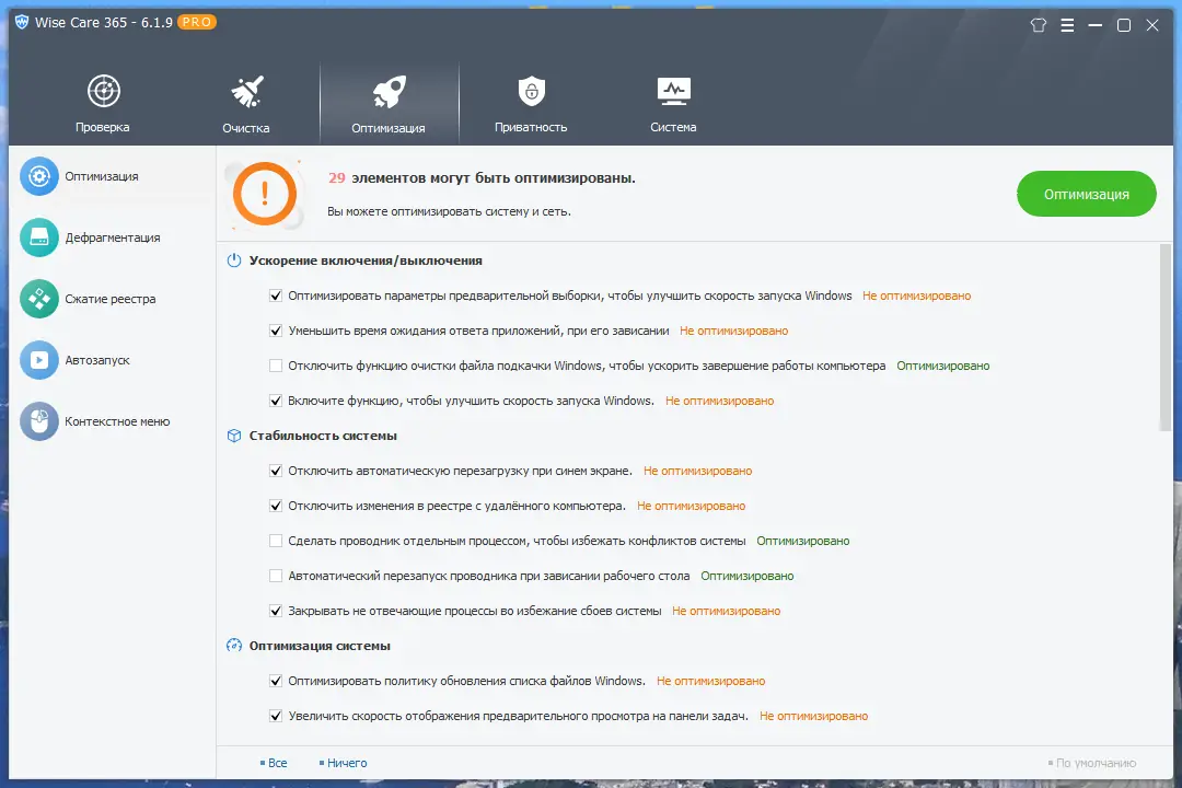 - Очистка, дефрагментация и оптимизация реестра Windows.