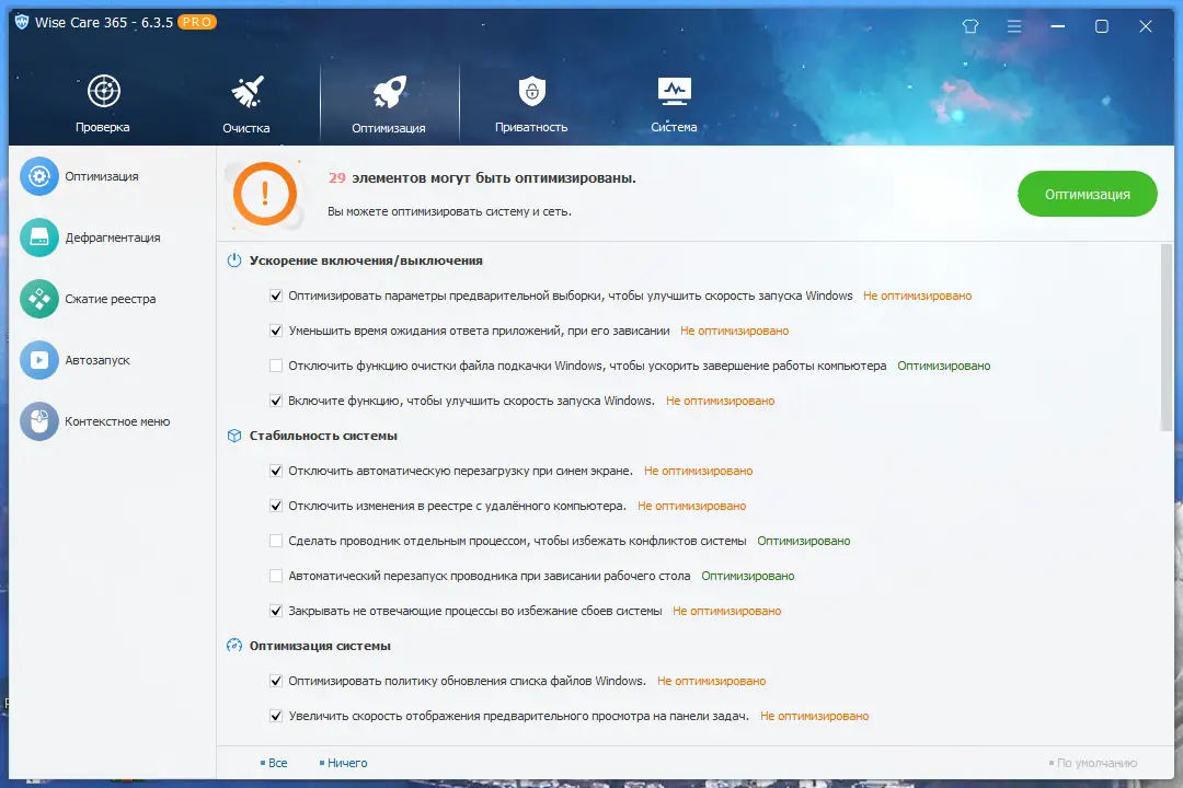 Wise Care 365 – это мощный программный пакет для оптимизации и обслуживания компьютера под управлением Windows. Он помогает быстро и безопасно очистить системный реестр, освободить место на диске, дефрагментировать файлы и реестр, а также восстановить удалённые данные. Также программа позволяет блокировать запуск приложений с помощью пароля, управлять автозагрузками, оптимизировать оперативную память и выполнять задачи по расписанию, обеспечивая стабильную и быструю работу системы.